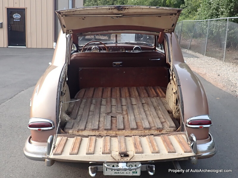 Great-looking 40’s-era interiors were a trademark of Kaiser-Frazier cars, and this Vagabond is no exception. I hope the next owner likes the color brown, because there’s a lot of it along with all of that beautiful chrome trim. The front seat has been reupholstered (and doesn’t match the original attractive ribbed-vinyl upholstery of the rear seat), the cool, large steering wheel is showing some age, and there’s no floor coverings in the front. The door panels look very good and features a unique push button release, and the gorgeous dash and instrument panel, along with the headliner, are in great shape. The cargo area has definitely been used as intended. The wooden slats are all there, but look weathered.