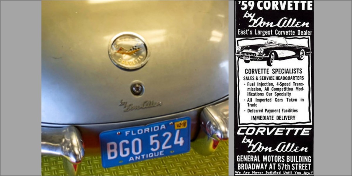 Imagine my surprise when I found this original ad for the dealership selling 1959 Corvettes! Apparently Don Allen Chevrolet in New York City occupied the lower two floors of GM’s New York headquarters and sold a lot of Corvettes! That might explain the New York license plate on the front of the car. However, it turns out there was also a Don Allen Chevrolet (using the same font, so they must have been part of the same dealership organization) in Miami, Florida. So who knows the details as to which Don Allen the car came from? I’m guessing New York, myself. There are some copies of other 1959 Don Allen Corvette ads here on the C1 Registry page.