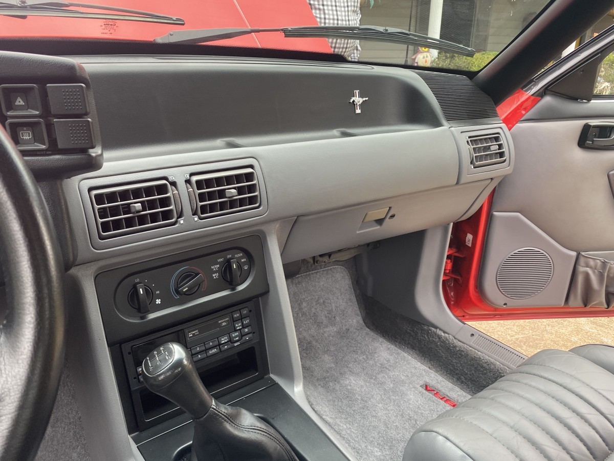 Gray leather is a sharp look for a Mustang of any flavor, but it looks particularly sharp against the bright red paint. The seller notes the Cobra has been garage kept and there’s obviously no signs of sun damage or other effects of being left out in the sun. The leather shows virtually no creasing or other evidence of regular use, as you’d expect for the sub-20,000 miles on the odometer. The carpets and dash also present as-new, and the factory radio head unit remains installed in the center stack.