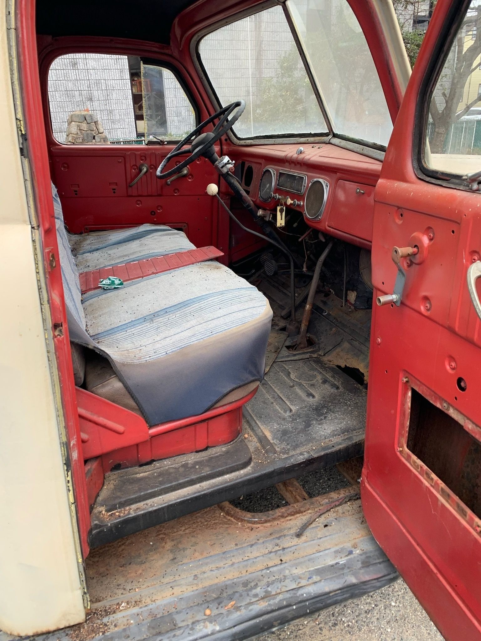 Trim pieces are also accounted for, including front and rear bumpers with brackets, headlight rings, parking lights, and the factory hood ornament. The seller also has a stainless steel grille with all the bars intact, which could be restored to show condition with some polish. Inside, the original interior remains intact, giving the truck a true period feel and a solid base for either a sympathetic refresh or a full restoration.