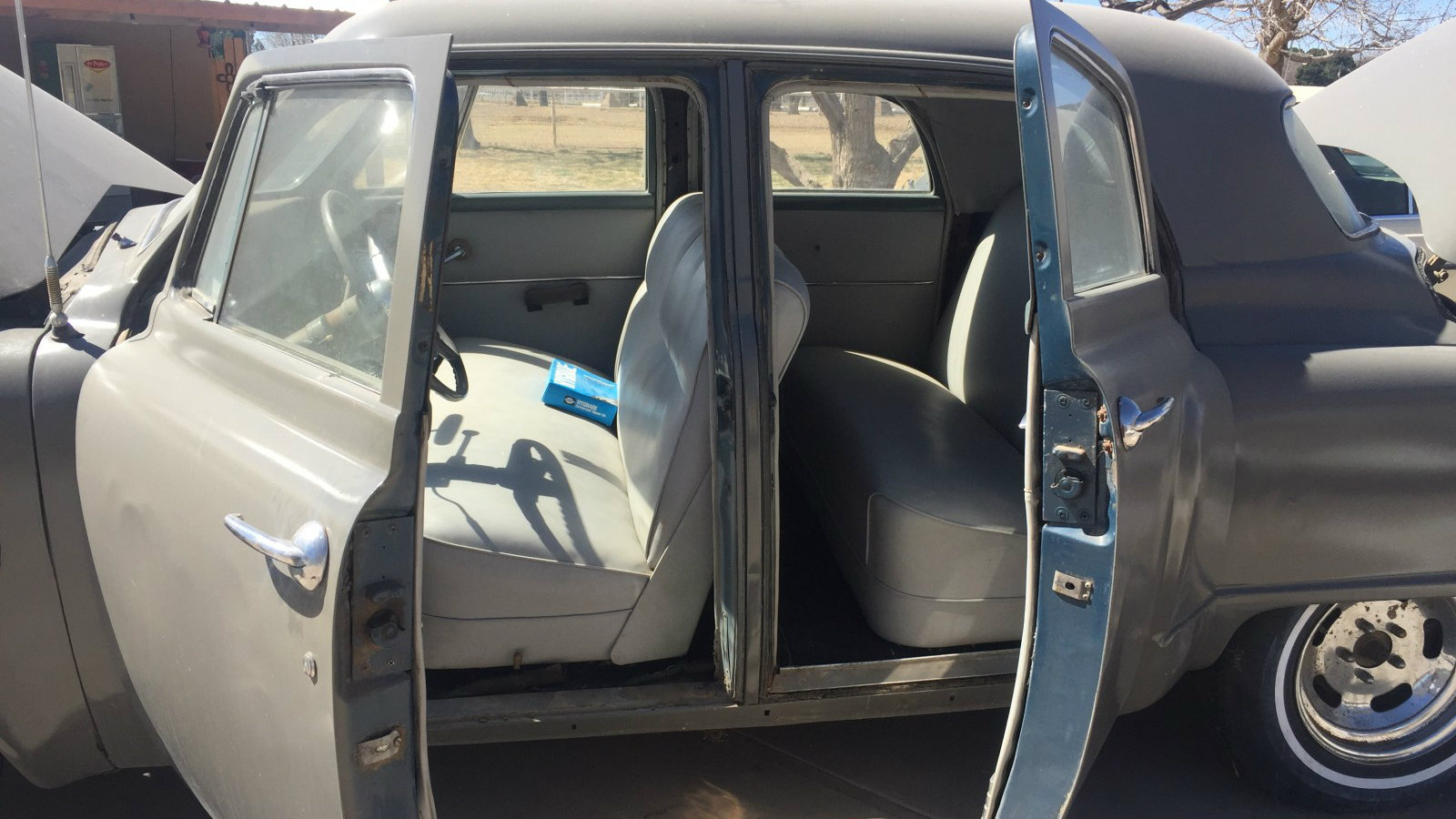 I think the suicide doors are just cool. I’m wondering if the blue was an original color; I think it would look nicer than the current gray, and would contrast nicely with the interior.