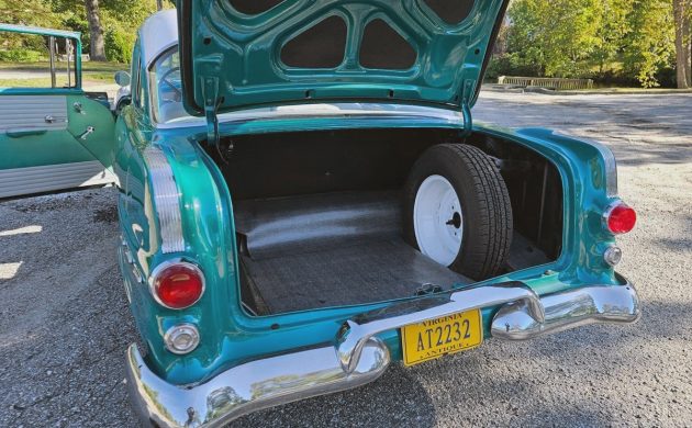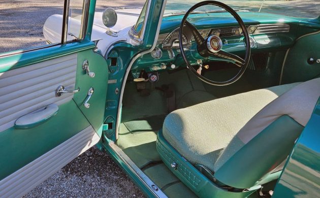 The seller is very light on photos, unfortunately. For such a nice-looking, restored car, I don’t understand why there weren’t two dozen or more photos added to the listing. Maybe they would send more photos to anyone who is interested. The interior has been redone, and the door panels aren’t what would have been the original style or pattern. I’m assuming the seat design and fabric are different as well. It all looks good, though, and this car has a three-speed manual on the column. Our black and white ’56 sedan had an automatic ($188), a power front bench seat ($93), and power steering ($108), so this one appears to be a really basic model.