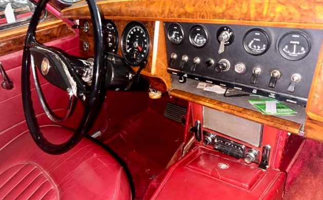Inside, the Jaguar continues to impress. The red leather interior is rich in color and character, pairing perfectly with the exterior finish. The wood veneer dashboard and trim remain in excellent condition, with clear gauges and original switchgear creating a cabin that feels both period-correct and inviting. It’s the sort of interior that reminds you why Jaguar was the go-to brand for luxury sports sedans in the early 1960s.