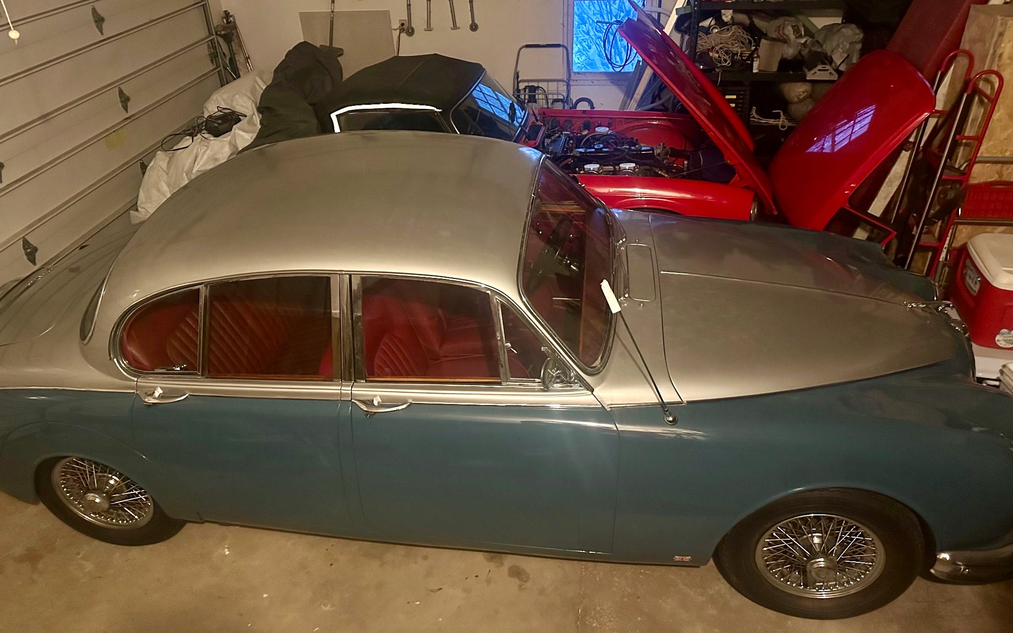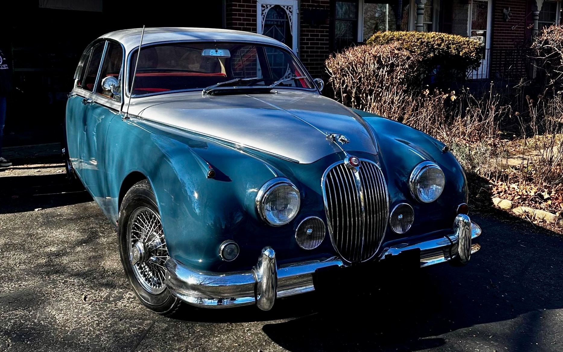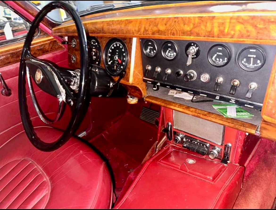 Inside, the Jaguar continues to impress. The red leather interior is rich in color and character, pairing perfectly with the exterior finish. The wood veneer dashboard and trim remain in excellent condition, with clear gauges and original switchgear creating a cabin that feels both period-correct and inviting. It’s the sort of interior that reminds you why Jaguar was the go-to brand for luxury sports sedans in the early 1960s.
