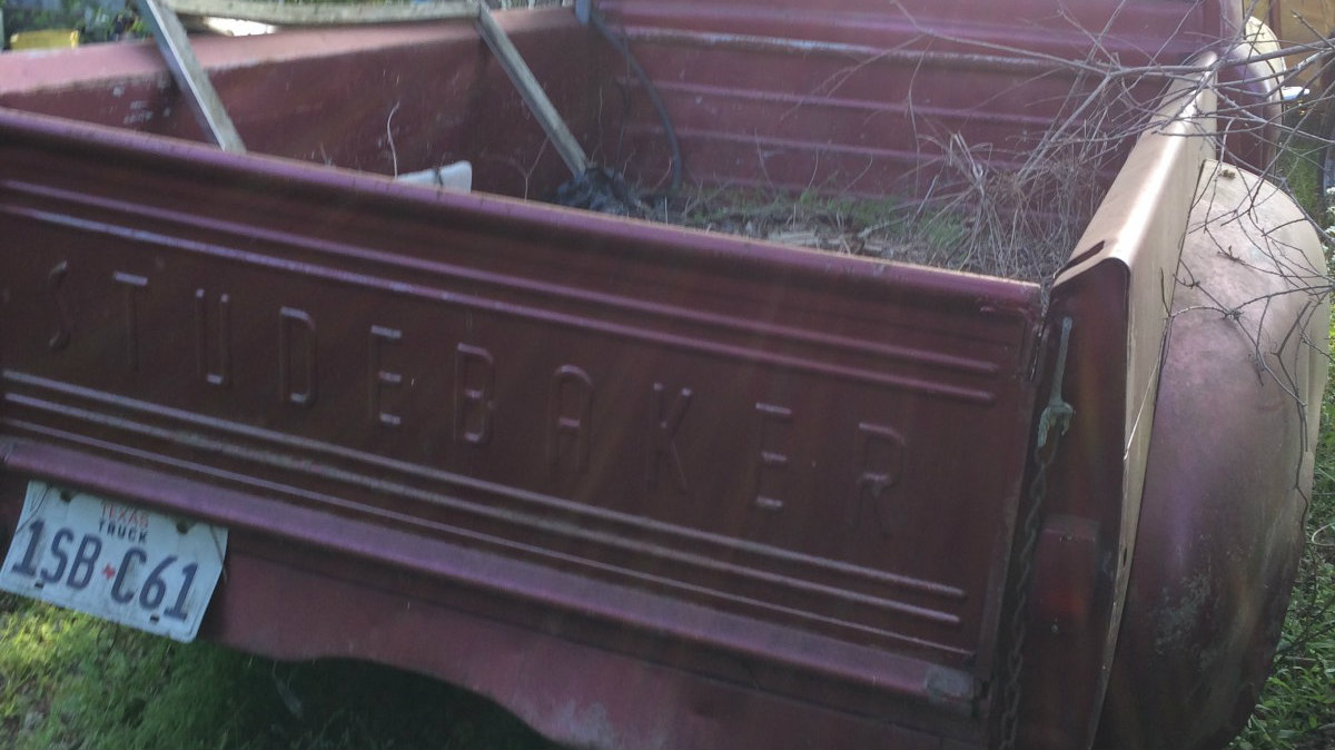 The current paint looks like it was a basecoat/clearcoat finish and the clearcoat has peeled in spots. Unless you like that kind of look, you’ll probably want to repaint the truck, however it looks like you have a relatively non-rusty body to work with. John describes it as a “1/2 ton Studebaker pickup, cab and bed in fair condition.”