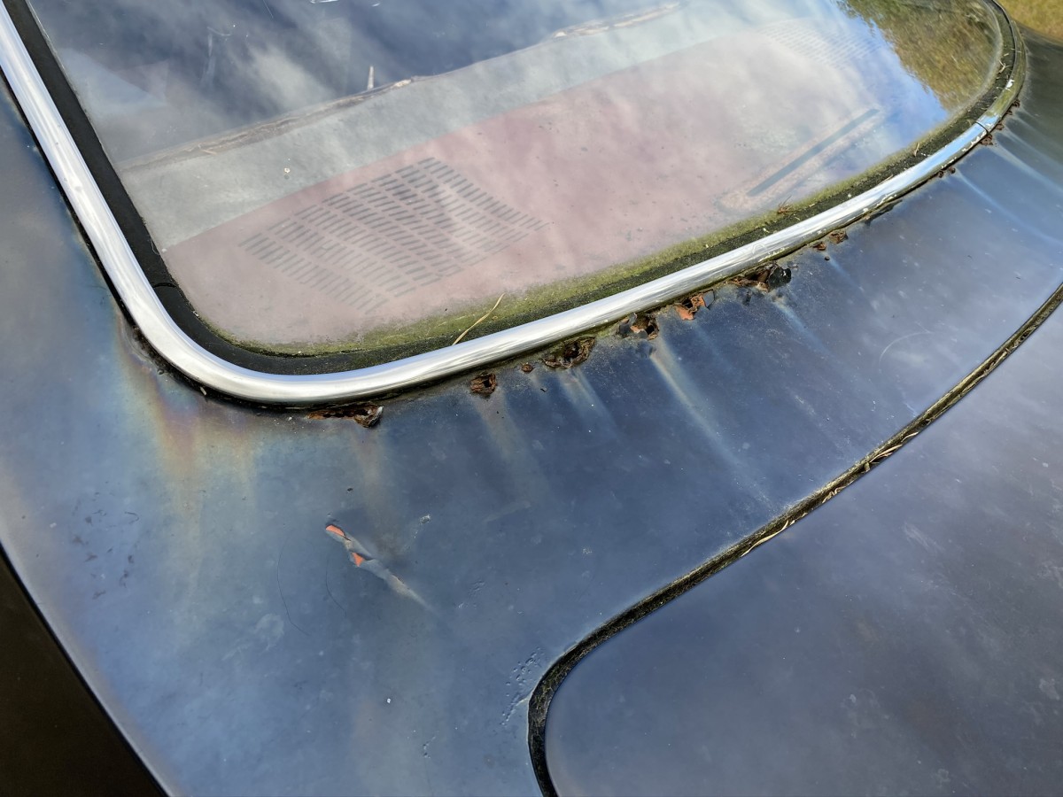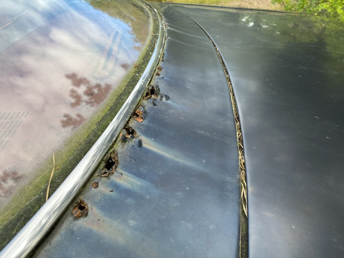 “…stored indoors until recently.” I’m having serious doubt about that statement. IMG-1083 is very telling. Pine needles in the trunk seal area. Those rust holes below the rear window scare me off. Might be a pretty nice parts car. A PPI would certainly be in order.