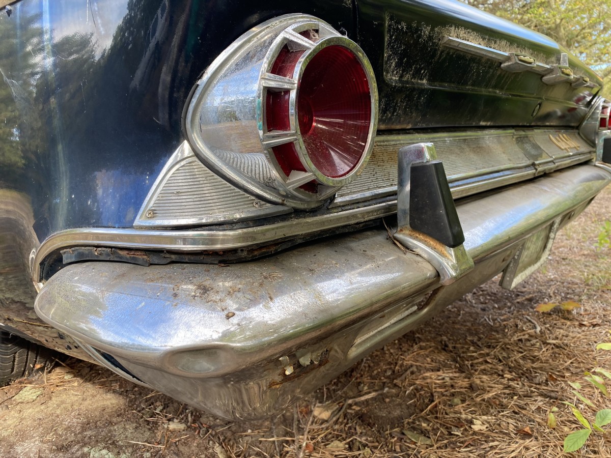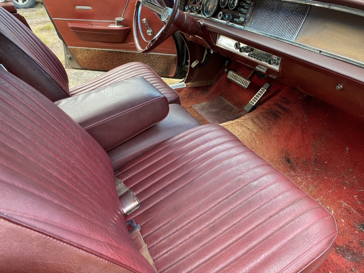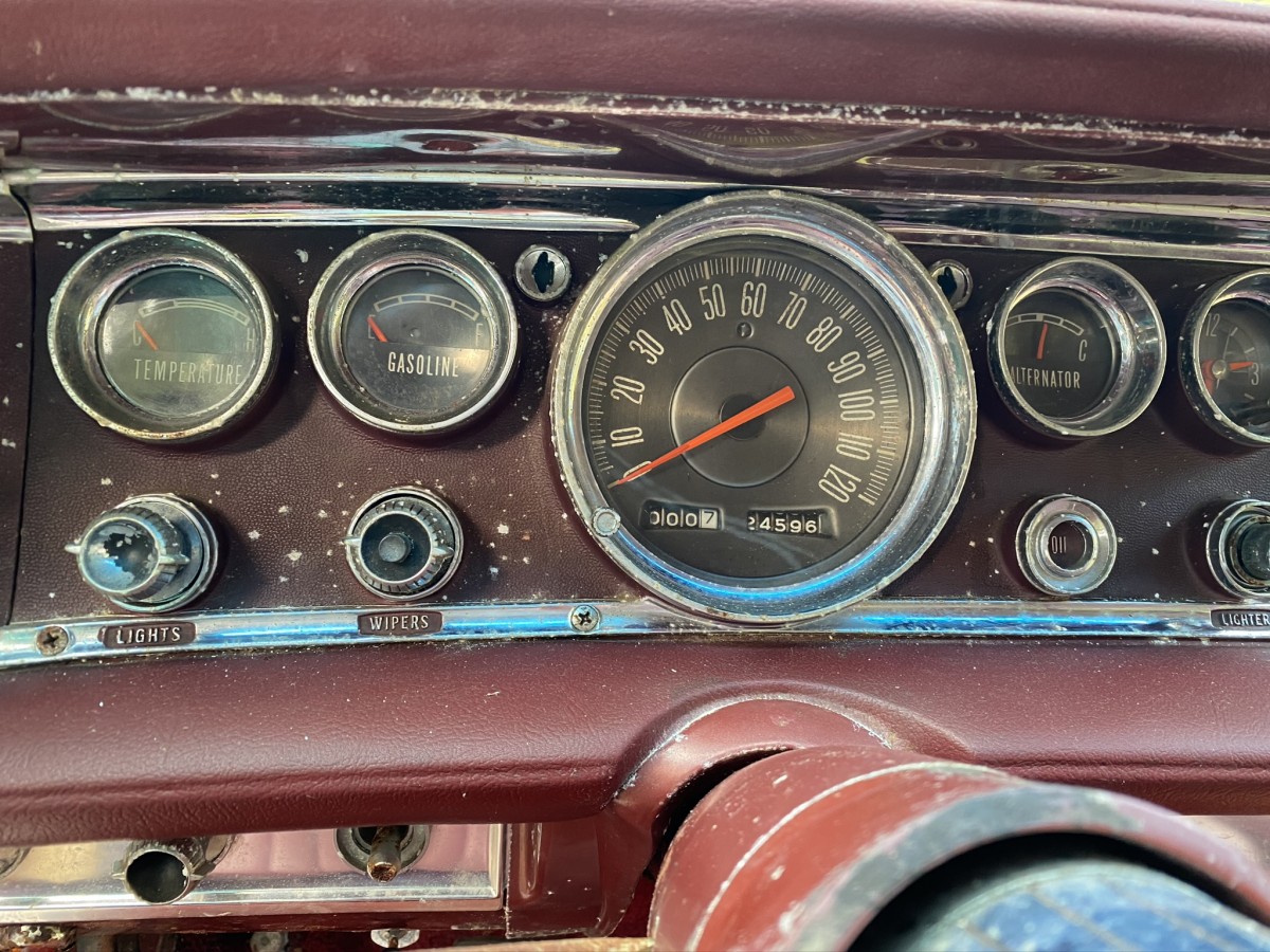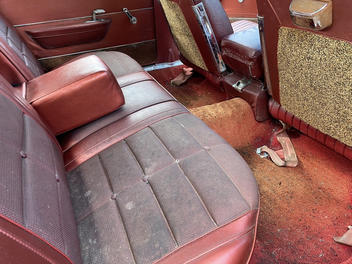 The 1963 New Yorker came standard with a 413 V8, and this example was running when parked. The New Yorker currently does not run, and hasn’t in some time. The engine latch or hood cable is frozen, and I wasn’t able to get the hood open on my visit. The cosmetics of the car are decent aside from rust which is shown in the video and photo gallery below, and primarily isolated to two places on the body. The chrome bumpers still present well and all factory badges are in place. Taillight lenses look good, too.