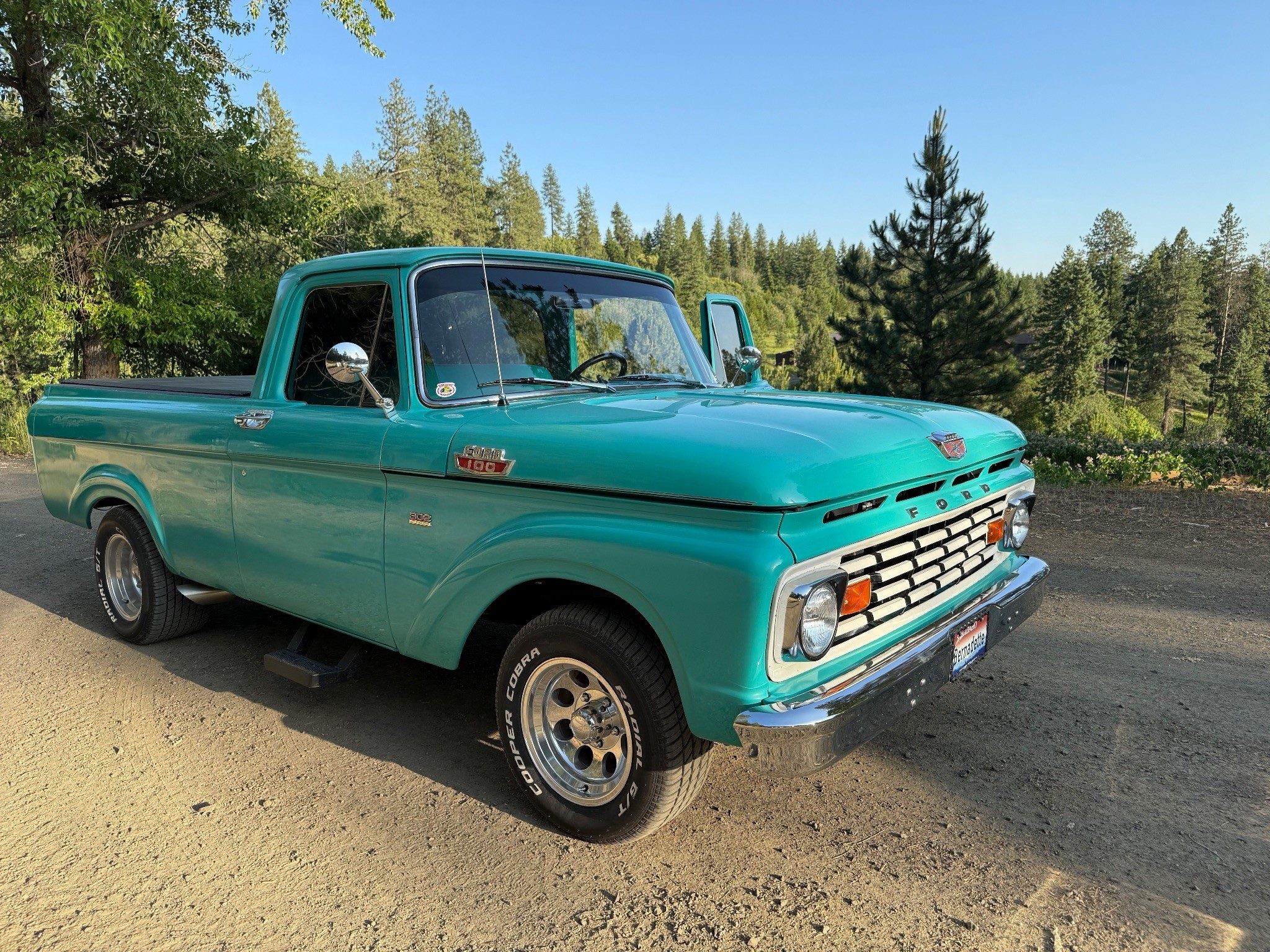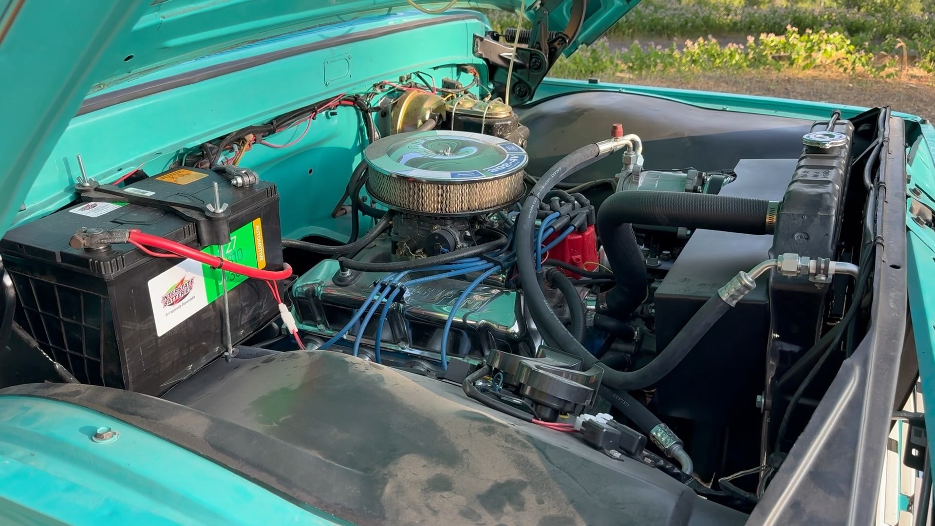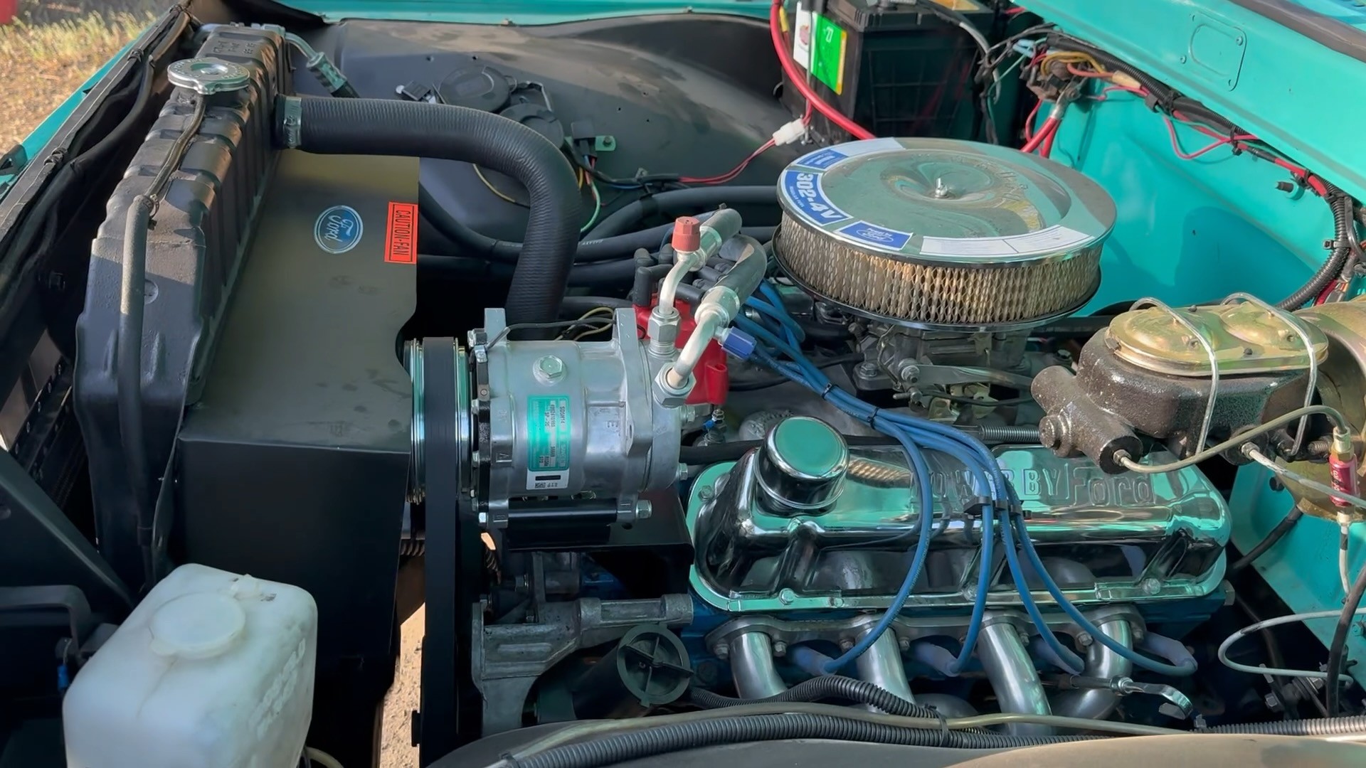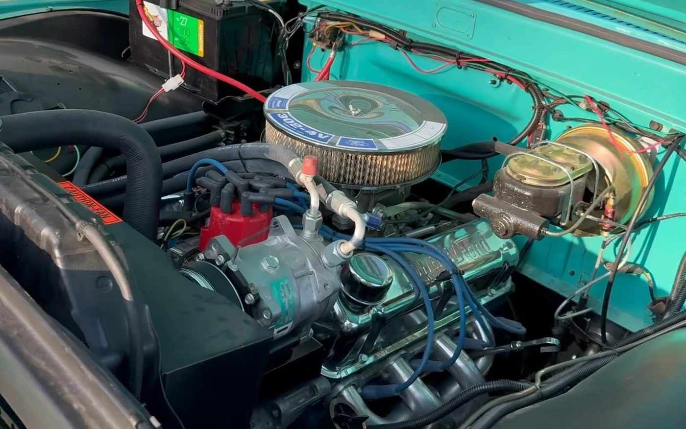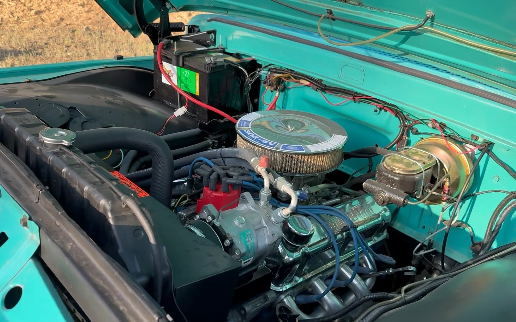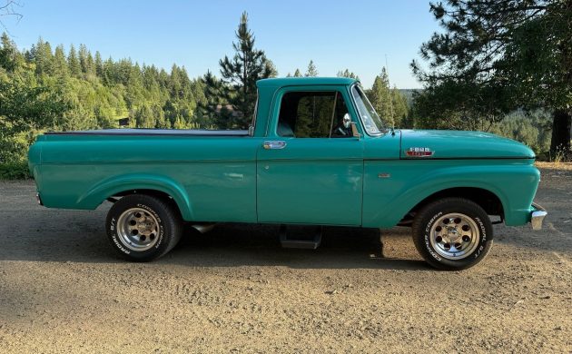 The 1963 F-100 engine lineup was somewhat limited, with a standard 223 six or an optional 292 Y-Block, which this truck most likely had when it rolled off the assembly line. Along the way, someone replaced the old 292 with a more modern 302 with some modifications, including an Edelbrock four-barrel carburetor and a set of headers. Although a Cruise-O-Matic was available in the F-100, a newer C4 has been installed behind the 302, and according to the seller’s friend, the 302 “runs strong” and the C4 “shifts nicely.” The truck also has power steering, power four-wheel drum brakes with a dual-circuit master cylinder, and aftermarket air conditioning with heater and defroster.
