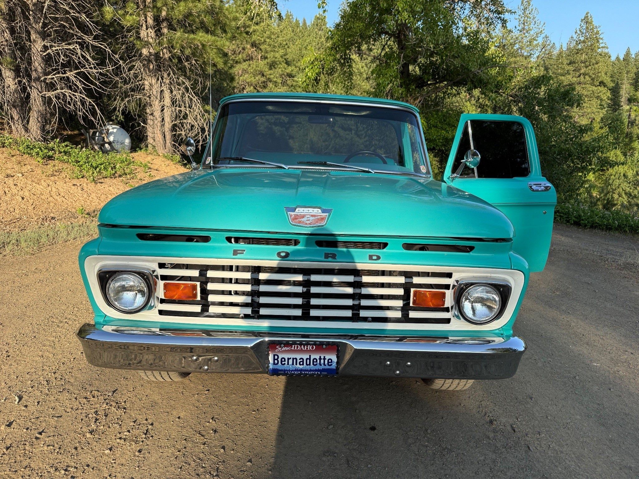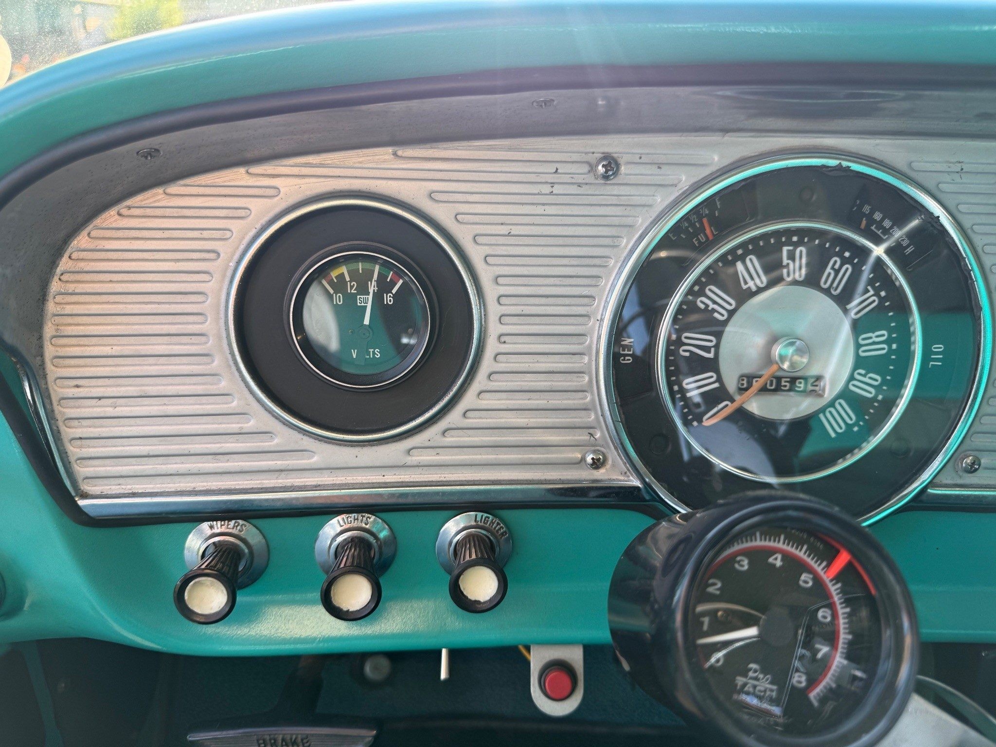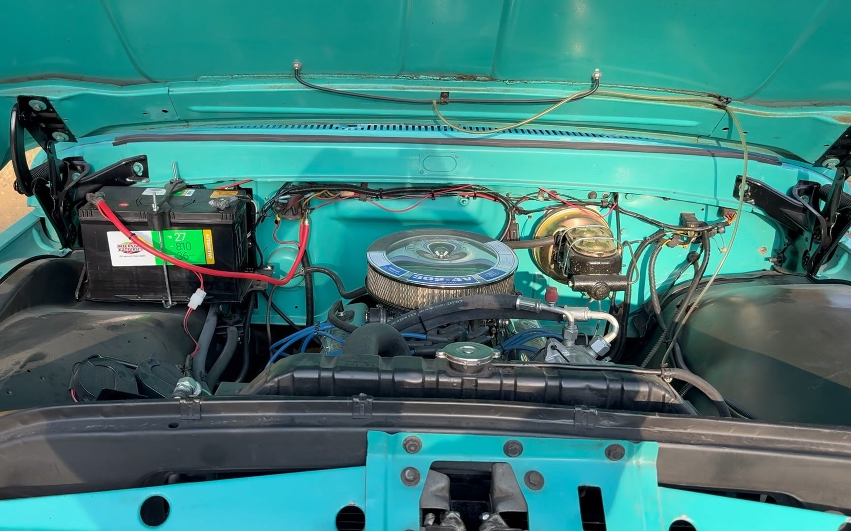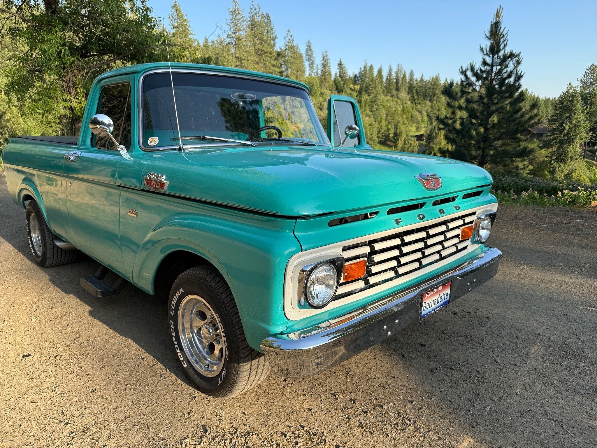 The 1963 F-100 engine lineup was somewhat limited, with a standard 223 six or an optional 292 Y-Block, which this truck most likely had when it rolled off the assembly line. Along the way, someone replaced the old 292 with a more modern 302 with some modifications, including an Edelbrock four-barrel carburetor and a set of headers. Although a Cruise-O-Matic was available in the F-100, a newer C4 has been installed behind the 302, and according to the seller’s friend, the 302 “runs strong” and the C4 “shifts nicely.” The truck also has power steering, power four-wheel drum brakes with a dual-circuit master cylinder, and aftermarket air conditioning with heater and defroster.