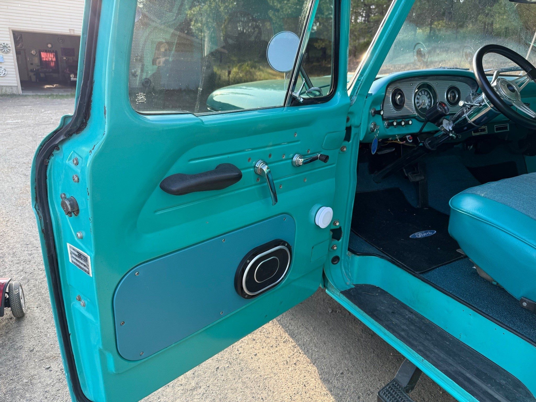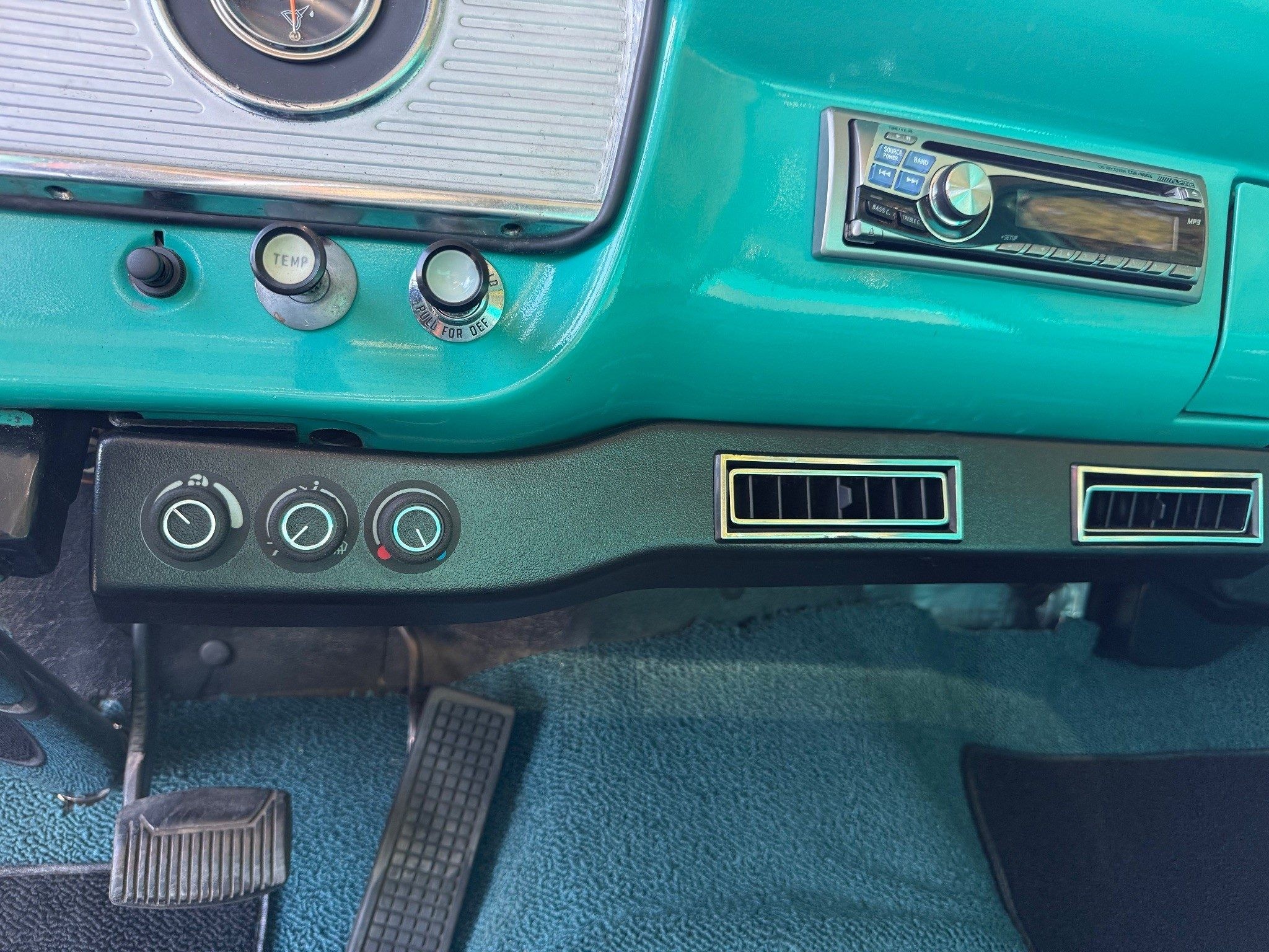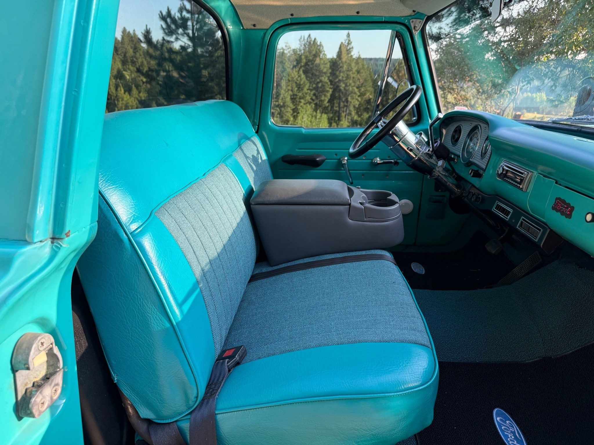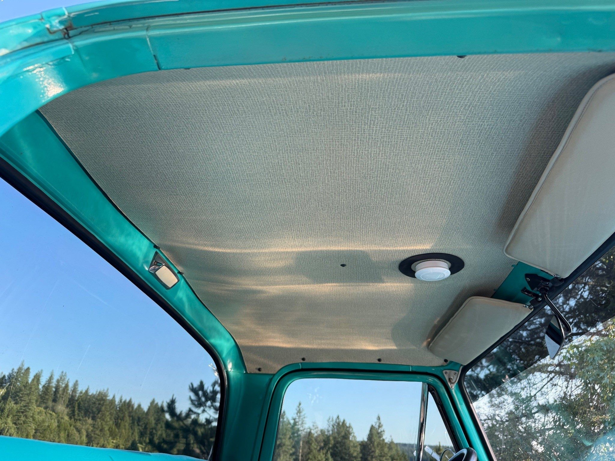 In addition to the bright teal/aqua/turquoise paint job, the interior has been redone in a similar vein (the upholstery has also been recently replaced). This F-100 is a “Custom Cab” model, which originally came with the following comfort and convenience features that don’t seem like they’d be options in this modern world of luxury trucks: