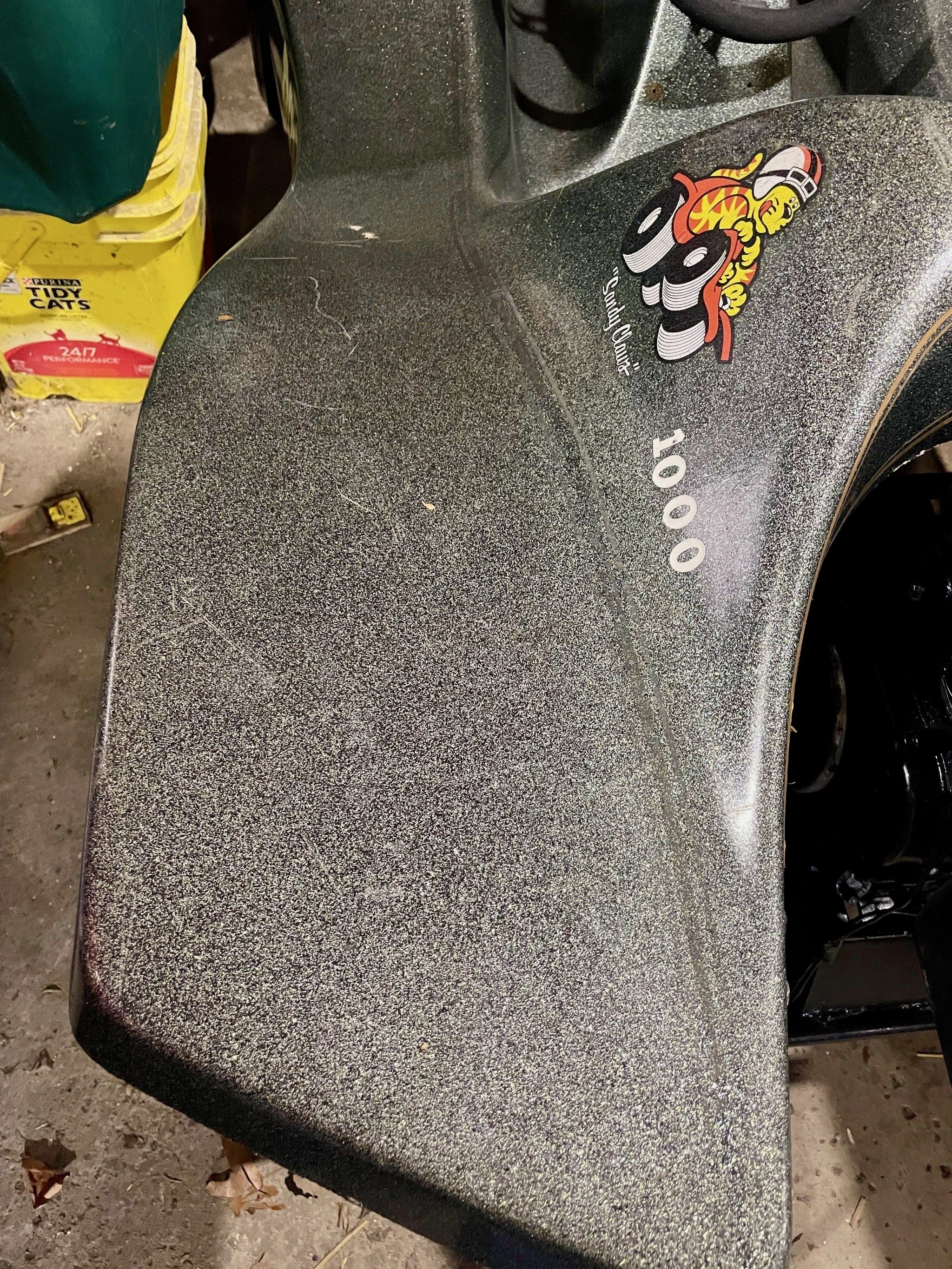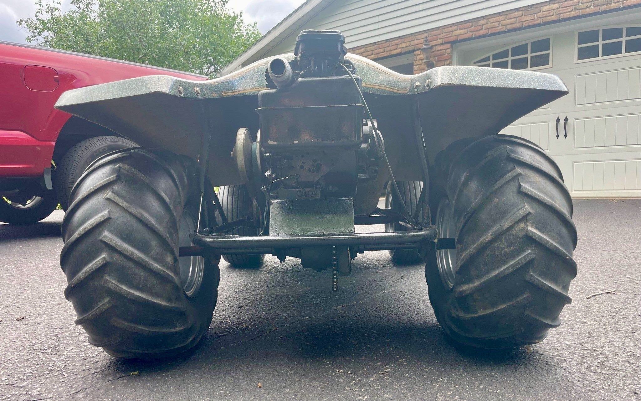 I’m assuming the wheels have been repainted and it may be wearing replacement rubber, but we don’t know for sure. If those are original tires, I’d want to replace them before hitting the sand dunes, given the rule of a-decade-is-old-enough for tires before you have to start worrying about them. I believe this would have had knobby tires in the back, or possibly on both the front and rear. As the owner of an oddball vintage three-wheeler, I know that those knobby tires are sometimes unavailable, so you do what you can.