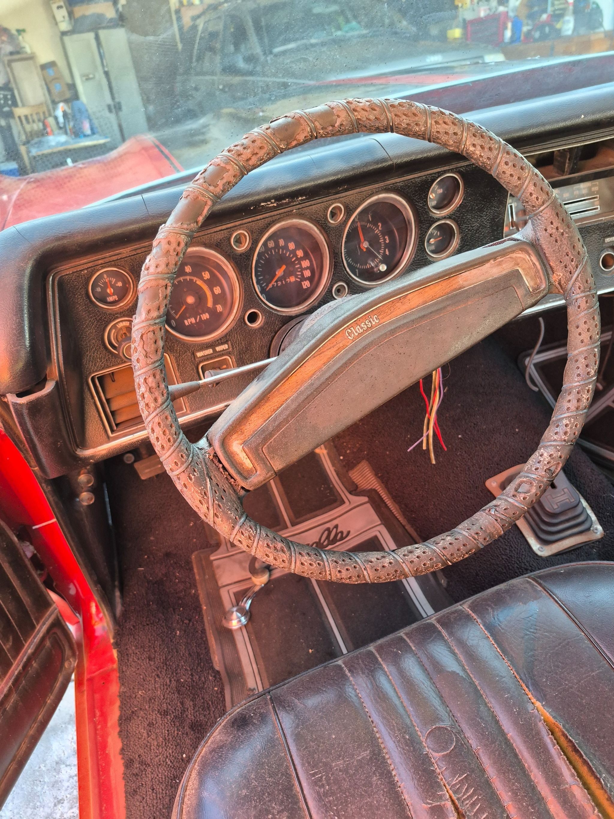 Incorrect steering wheel doesn’t bother me, but that shifter boot and location of the shifter hole is not correct for either a bench OR bucket seats. As someone else stated, that bundle of cut wires hanging from the dash tells me it’s gonna need all new wiring harnesses.