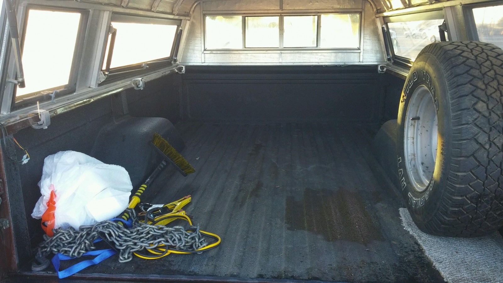 So the cruise control will need to be sorted. The interior is in very nice condition, with great colors, non-saggy door pockets and a bench seat with no visible tears. Larry notes the truck comes with a few other useful features and that there’s some minor bodywork to sort out: Equalizer hitch, sprayed bed liner, canopy accessible from all four sides. A/M radio, sliding rear window, gorgeous interior. Minor rust.