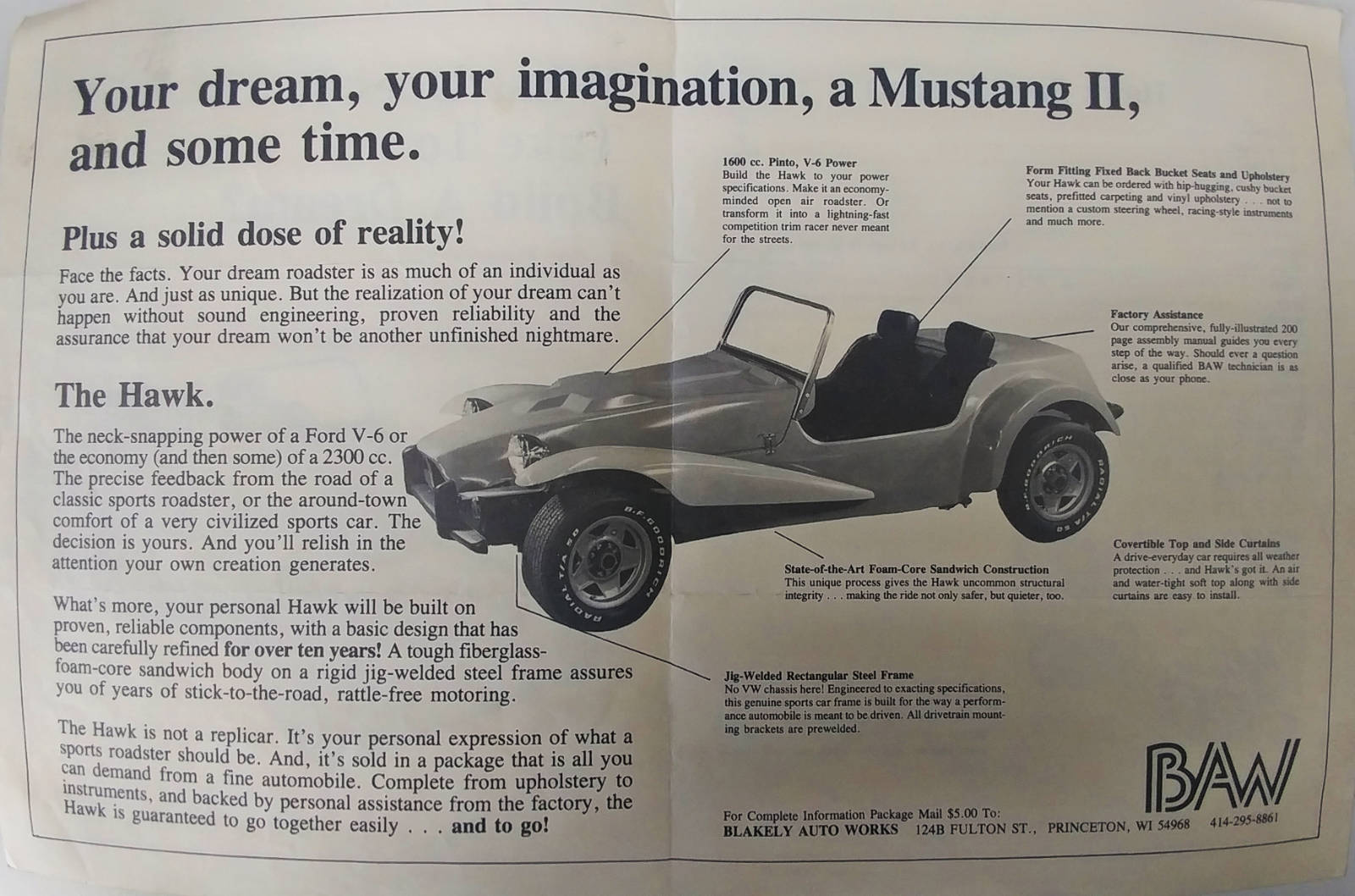 Yes, this car used a Pinto as its donor, but that isn’t a bad thing. While the body and chassis were manufactured by Blakely, the front suspension and drivetrain were pulled straight from a Pinto. Some things, like springs, are customized to work but the majority of parts are straight from the Ford parts bin and are readily available. I have all the documents for the Blakely and the 1972 Pinto that gave it’s heart to make this car go. The original owner kept lots of paperwork from the build, which obviously comes with the car. I have a clear title for the Blakely and a copy of the original title for the donor car. I even have the 1983 news paper classified where the builder found the Pinto!