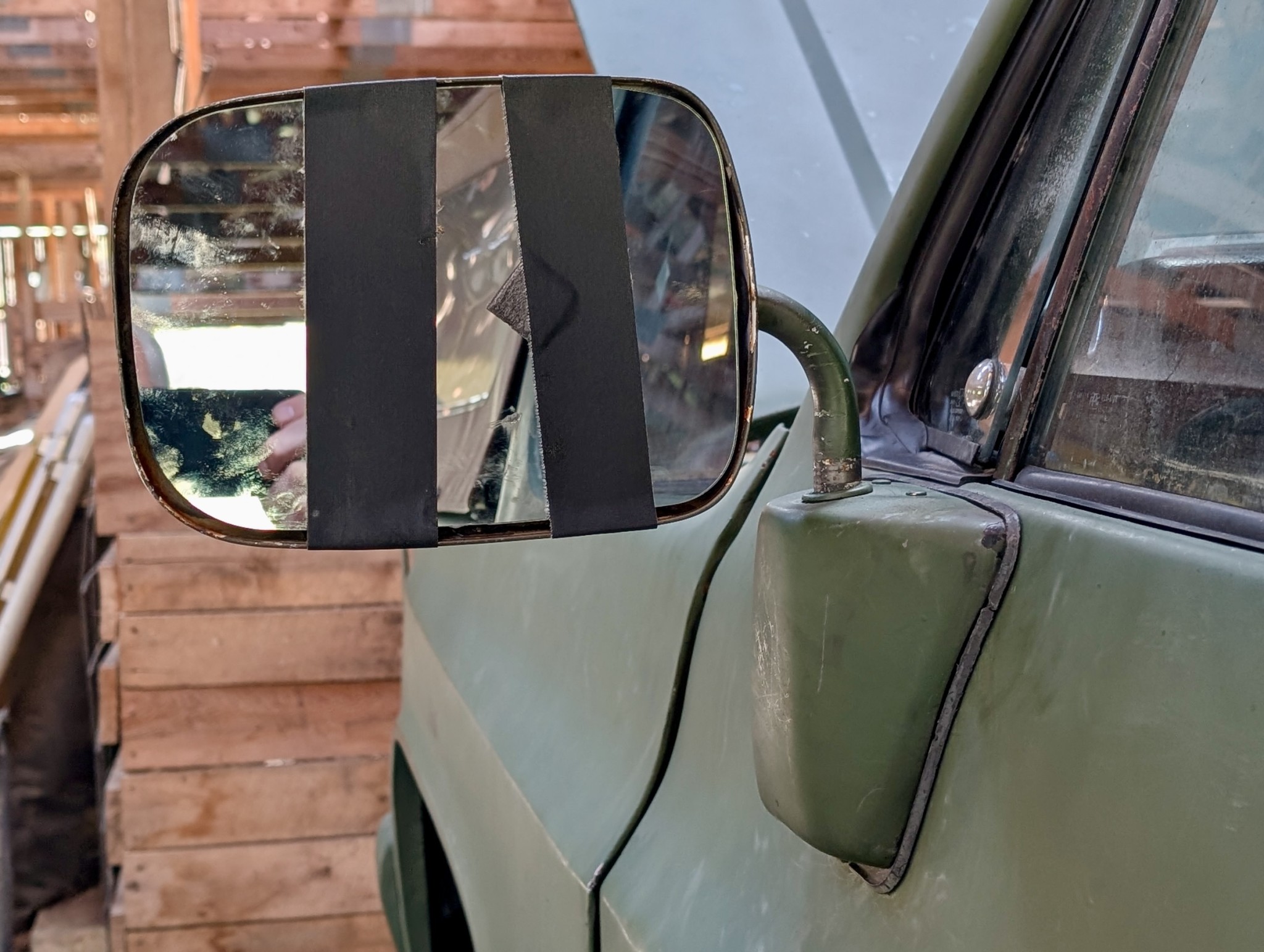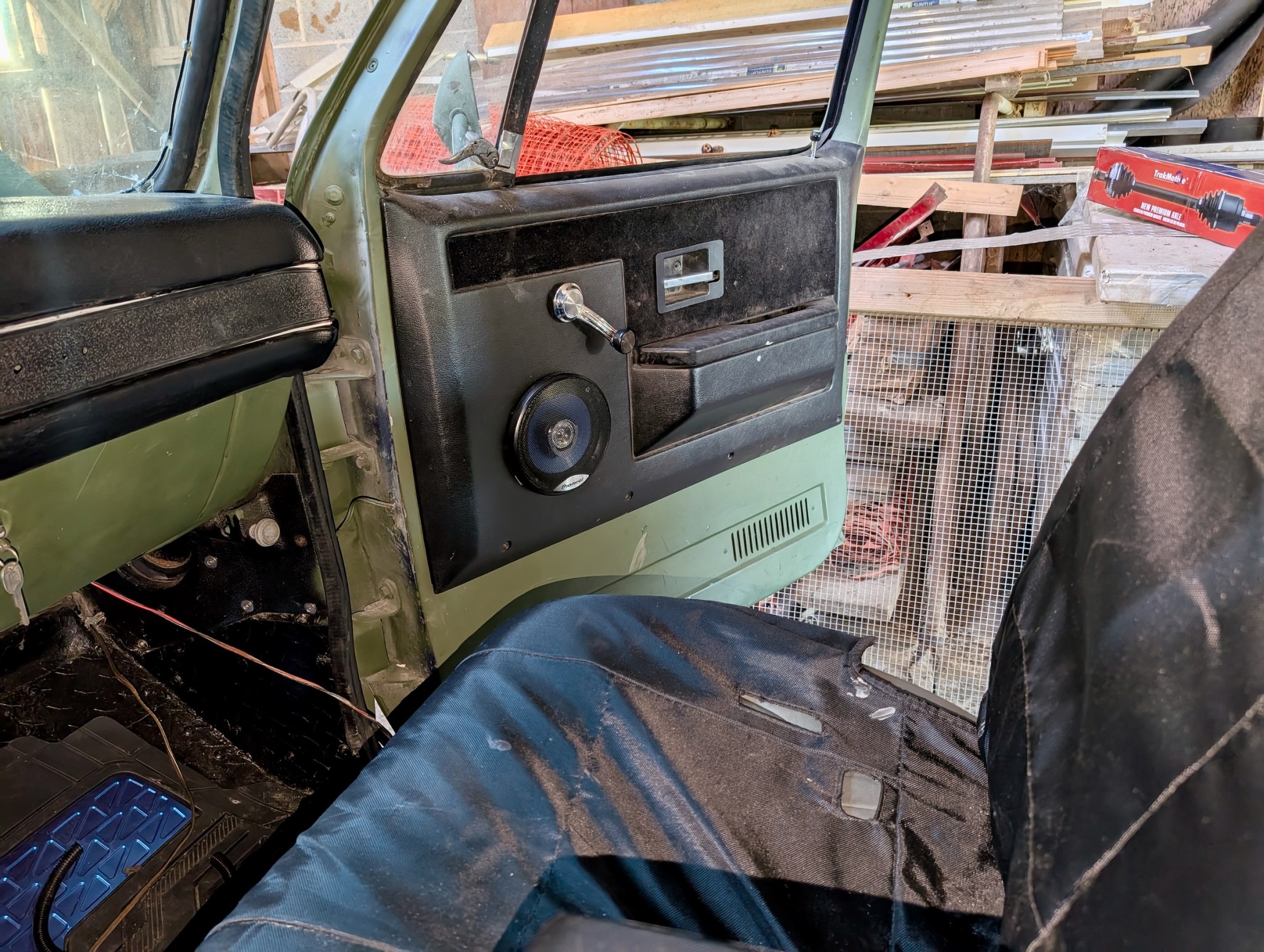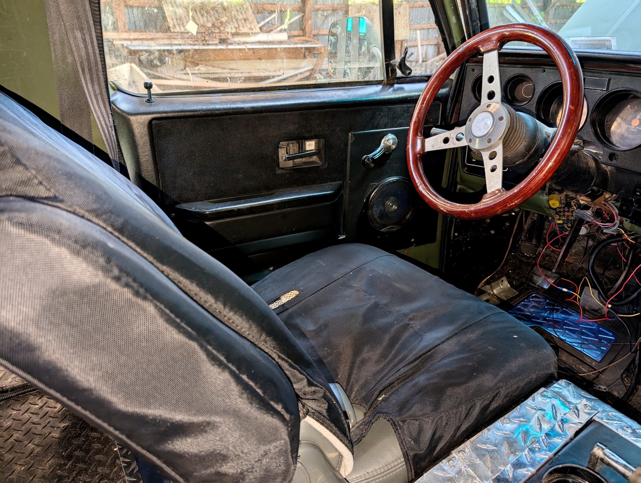 The seller has replaced the driver’s quarter panel and door skins and splashed on some army drab to even things out. It also has a new khaki Softopper vinyl top to cover the rear seating area, along with new door sills. There are some interior issues that the new owner will have to work out. The “front interior needs some completion.” At present the odometer is showing 71,000 miles.