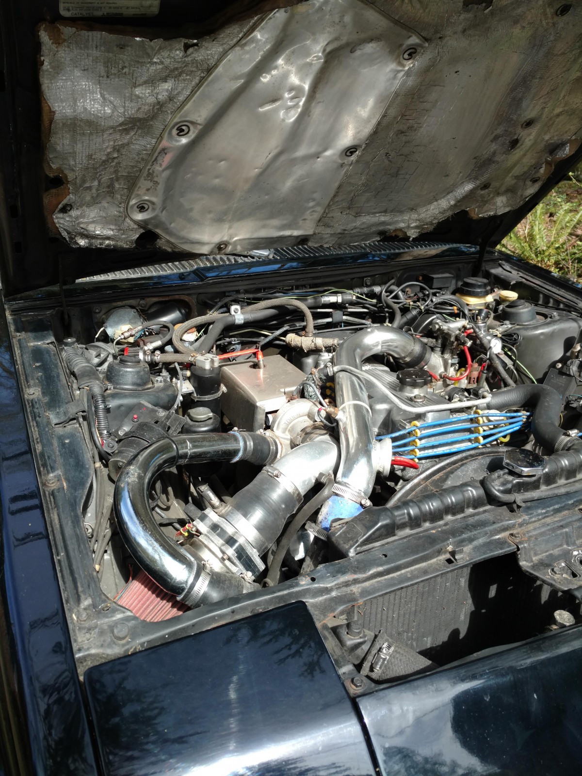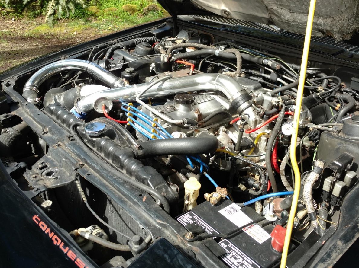 The interior appears to be holding up in acceptable condition, with black leather looking used but not tired. The leather may be a touch dry, but that be remedied by a professional detailer or your own hands some Sunday afternoon. Lots of spare parts are included in the sale, including: A/C system (prior owner had taken it out) I have all used parts for it; new custom built intercooler, new 8:1 hypereutectic pistons, new non-jet solid lifter cylinder head complete, DIY EFI manifold and tubular exhaust, new AR-60 turbocharger and associated plumbing hardware, balance shaft delete kit, and engine block.