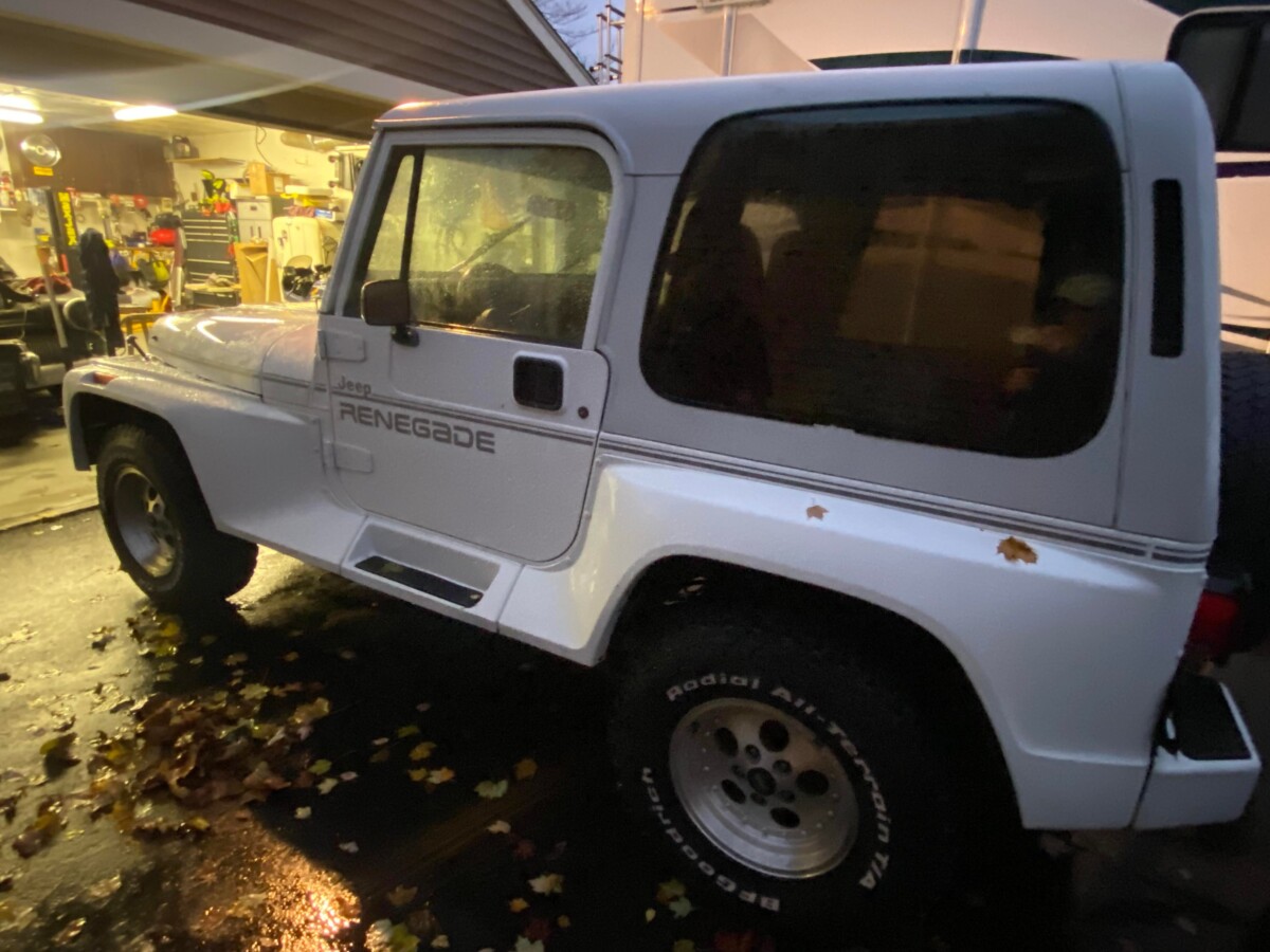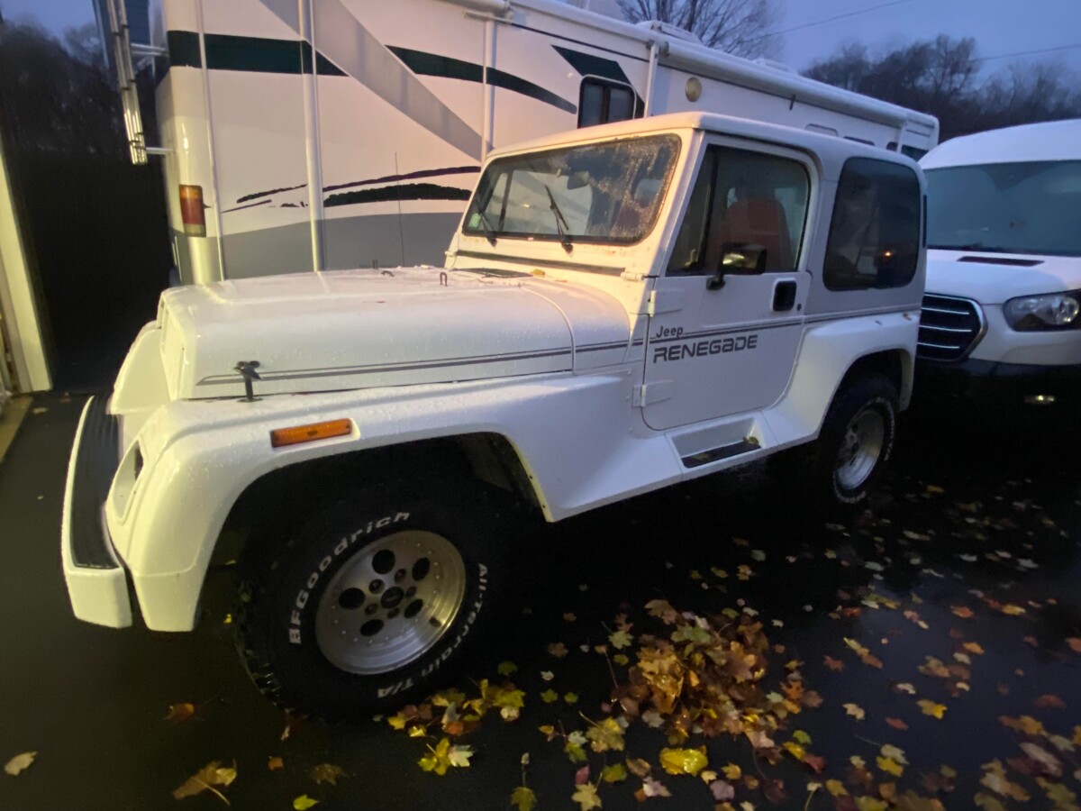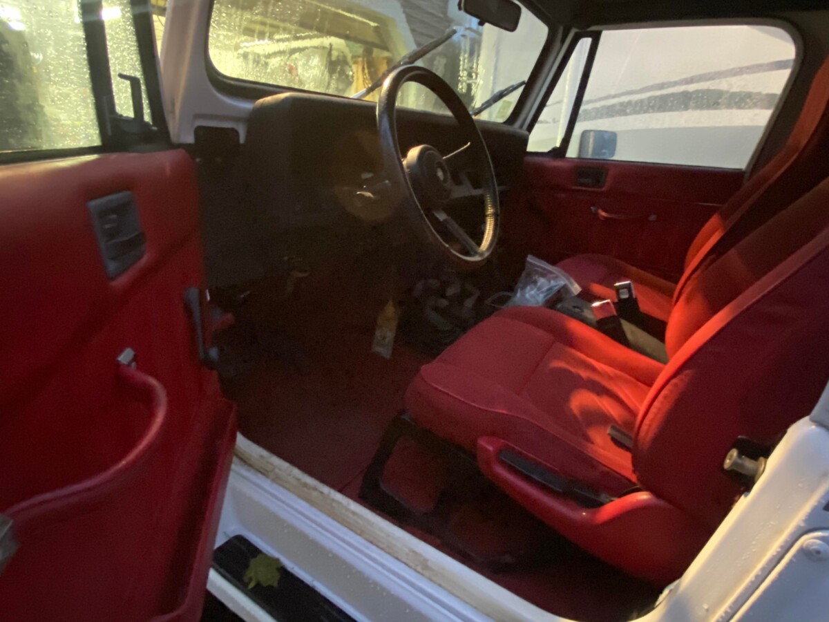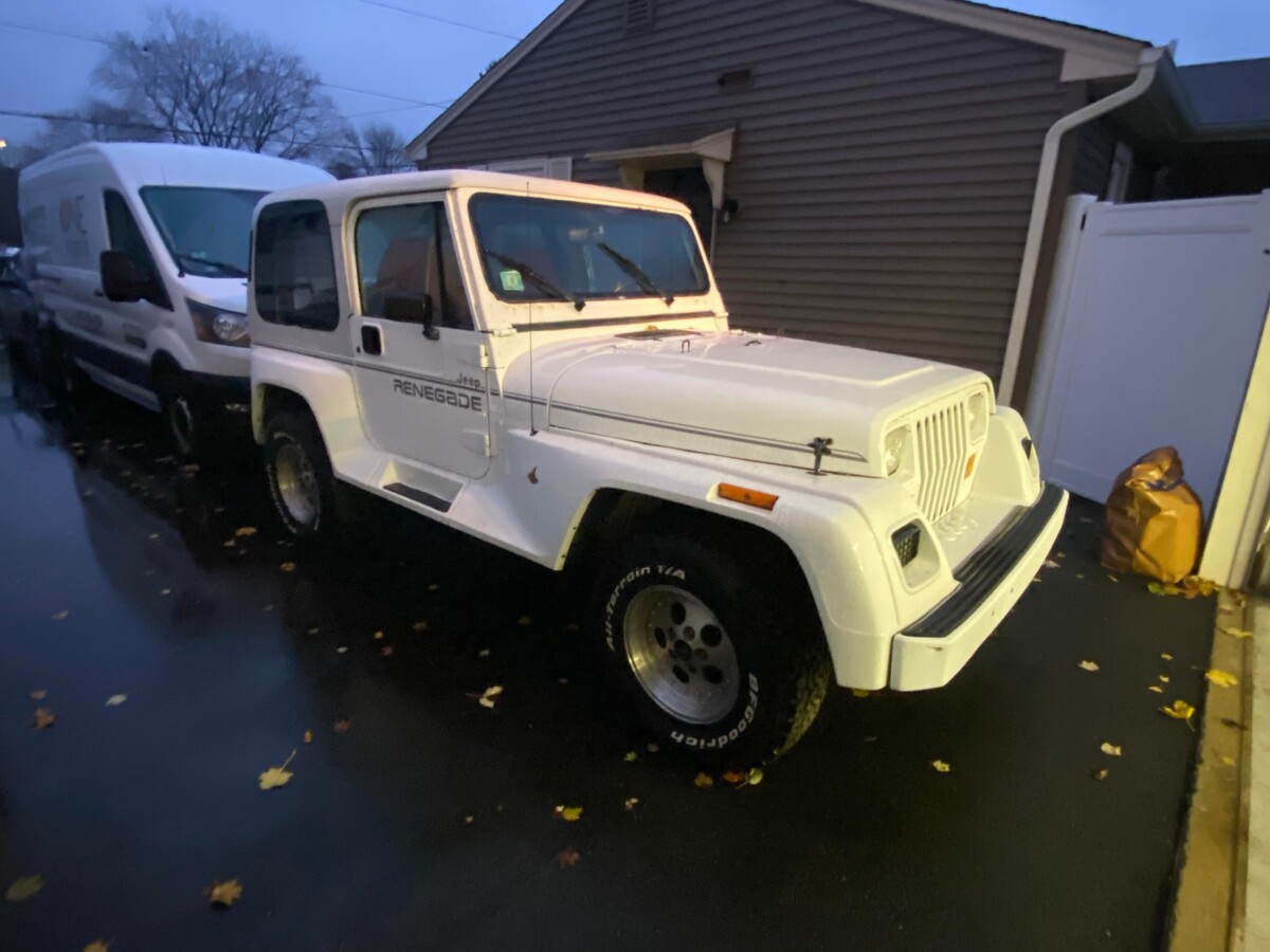 Tonight, I had the chance to check out a potential motorcycle project but what I found at the seller’s house was way better than an old crotch-rocket. The owner of the bike had a gorgeous 1993 Jeep Wrangler Renegade edition featuring the exceedingly rare combination of a red Trail Cloth interior with a white exterior. Mileage is under 100,000 and aside from the need for a replacement windshield frame, this is a time-warp specimen that is among the best I’ve seen anytime recently. I told the seller I would post it up here to get it some eyeballs and I’m happy to answer any questions I can or connect you directly to the owner.