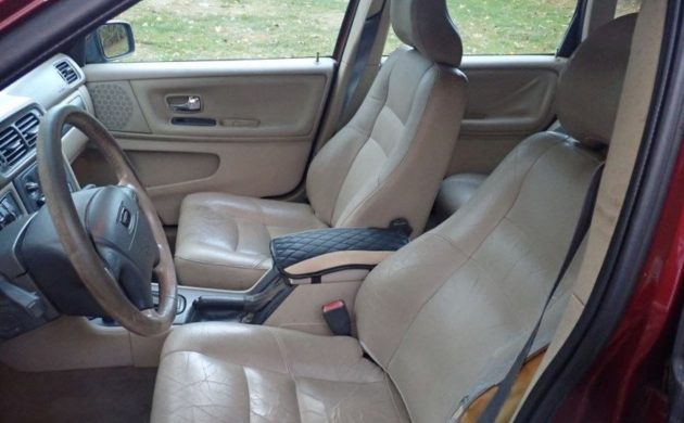 Inside, the leather interior shows typical wear for its age, with a split on the driver’s bolster and light cracking elsewhere. All the electrical systems reportedly function as they should—heated seats, air conditioning, power accessories, and sunroof—though the seller notes a security ring issue that occasionally requires a restart attempt before firing up. The fix will require a dealer reprogram, but the car runs reliably once started.