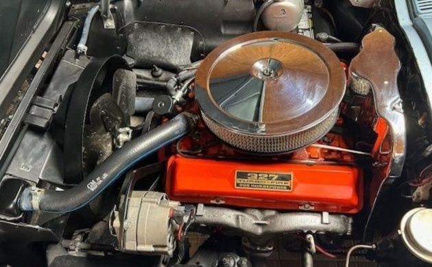 The 327-cubic-inch small-block is rated at 300 horsepower and retains its original HE-code block (engine number F0406HE, casting 3858174). The seller notes that a new clutch, throwout bearing, starter, and aluminum radiator were installed recently, along with fresh tires, new gauges, and tail lights. The original AM/FM radio and teakwood steering wheel are still in place, adding to its factory appeal.