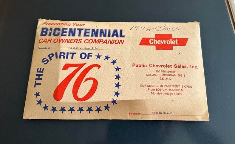 The seller’s ’76 Nova coupe looks like any other Nova. While it’s blue in color (including the interior), there is no reference to the bicentennial anywhere on the car that we can see. It has a basic 250 cubic inch inline-6 and it’s said to have had only two owners (including the seller) in its mere 27,000-mile existence. There is some literature in the mix of Chevrolet stuff that says “Spirit of 76” on it, but that’s as close to something different as it comes. So perhaps the seller is confusing the Spirit of America car for this one or perhaps there actually was a Bicentennial Edition. Or it was simply just built in 1976.