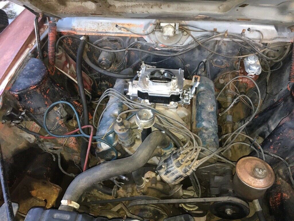 There’s a replacement 360 motor currently installed and said to be in running condition. Some of the good news with this car is that the original 343 cubic inch V8 engine with the factory Edelbrock R4B intake manifold is available and goes with the car. There’s no mention of the status of this engine, so I’d assume it will need to be rebuilt for a factory correct restoration. This is a 4-speed car with the 140 mph speedo and factory tach.