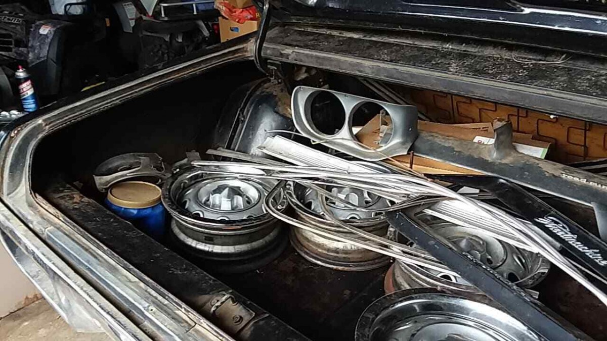 This is definitely going to be a project car. Many of the parts that go with the car are found in the trunk. This includes the chrome trim, front grille surround, hood trim, and front bumper which has been removed from the car. The Road Runner also comes with a complete set of Rallye Road Wheels.