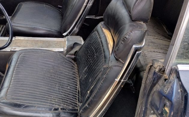 Inside, the black bucket seats and console remain original, with the upholstery described as fair. Both power front seats work, though the passenger’s reclining function is disabled due to a missing cylinder. The power windows all operate to some degree but need lubrication and electrical cleaning to work correctly.