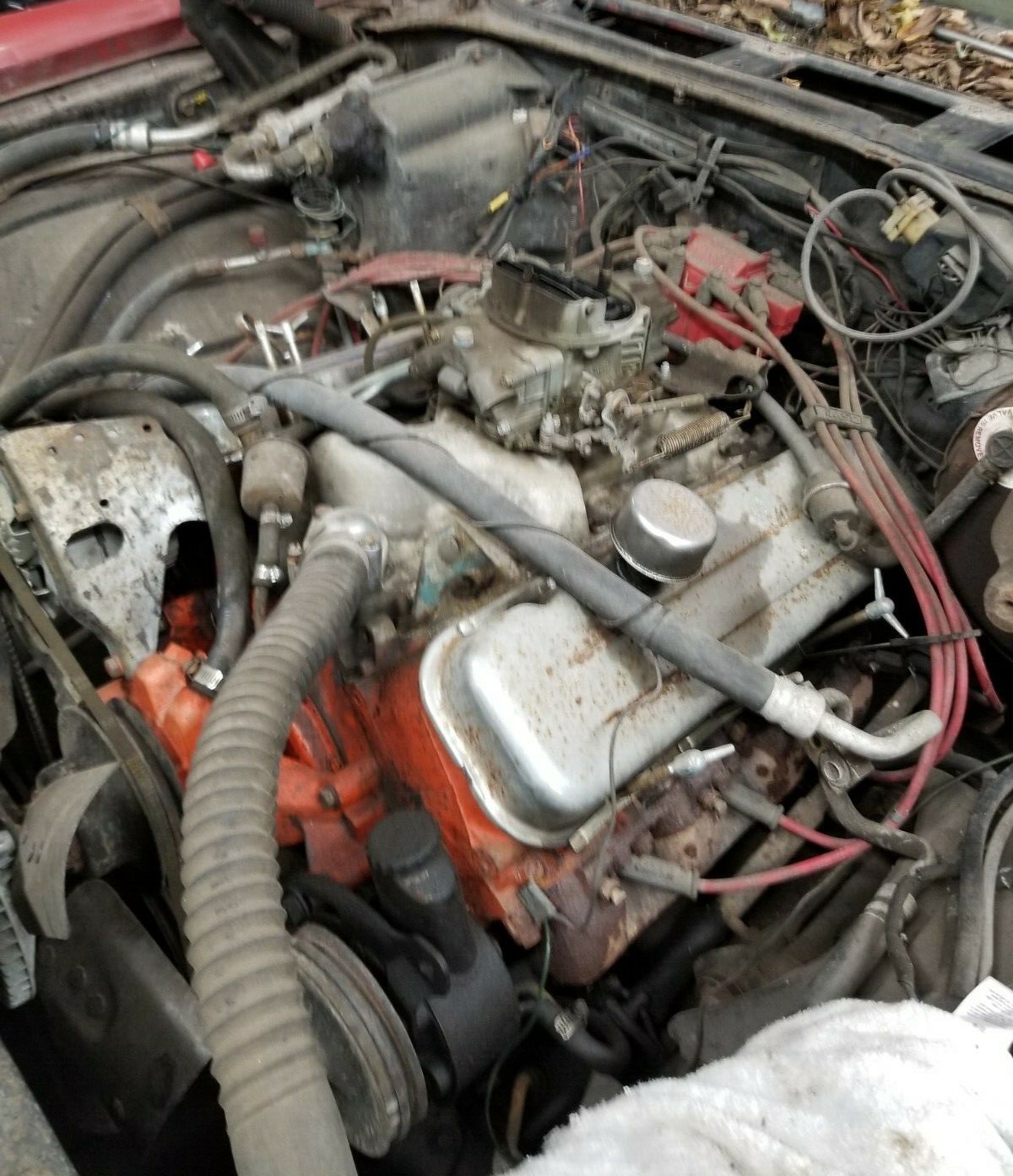 The body may be in transition as well, reflecting an older attempt at an SS. The red paint may or may not be the car’s original paint or color and it’s dirty in some photos and clean in others, with the front grille installed in some and not in others. So, we’re not real sure of where the body stands in the transformation right now. The beige interior will likely need work, but we don’t know the extent of it. The seller has replaced some of the floor pans and has a new convertible top and carpeting are waiting for the buyer to install. We’re told there is a ton of parts coming with the car and we hope the lot is sufficient to complete the work.