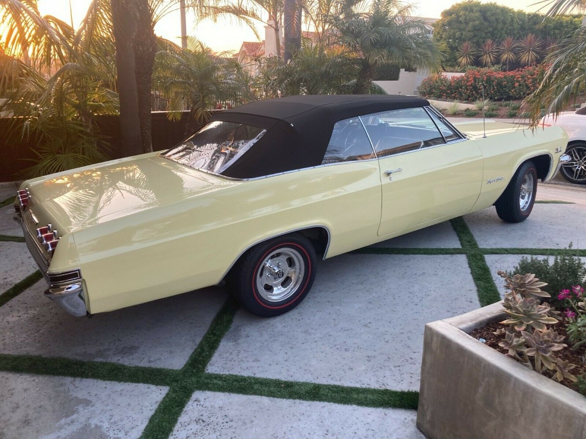 If this ‘pala is wearing Sunfire Yellow we can be 100% sure it’s not the original color – that hue was exclusive to ’66-’67 ‘vettes. The correct ‘Y’ color for ’65 fullsize Chevs should be Crocus Yellow. IMHO that’s a solid color that works extremely well on mid60s Chevs
