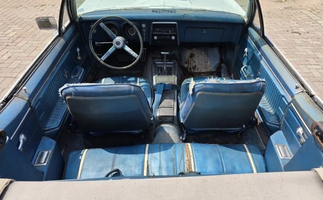 The blue interior nicely compliments the Ermine White paint which would have had a blue nose stripe. Call most of the interior overdue for a dumpster. Replacements come easy on the global inter-web, and should look stunning when complete.