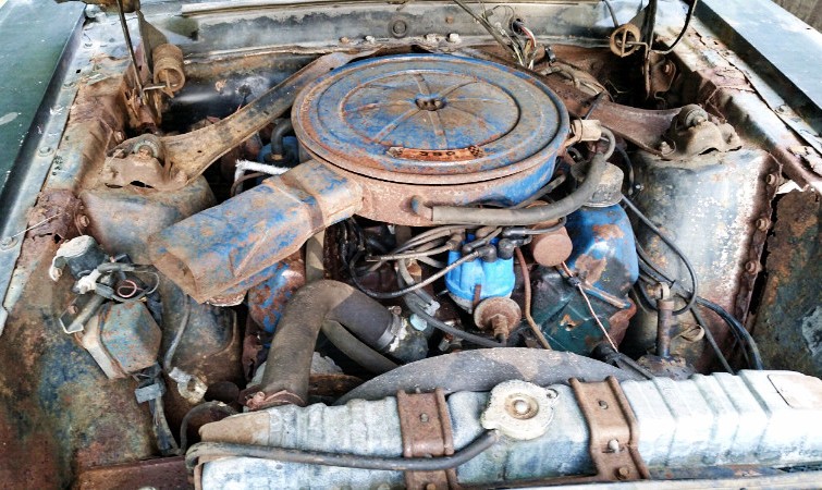 The seller states that this car is highly complete and it does appear to be, well minus the metal that’s rusted away. The interior actually looks to be in decent shape, all things considered. All the major components are present and in ok shape. You’ll also notice that this car is an automatic. It’s a C6 and is paired to a 9-inch Posi rear end.