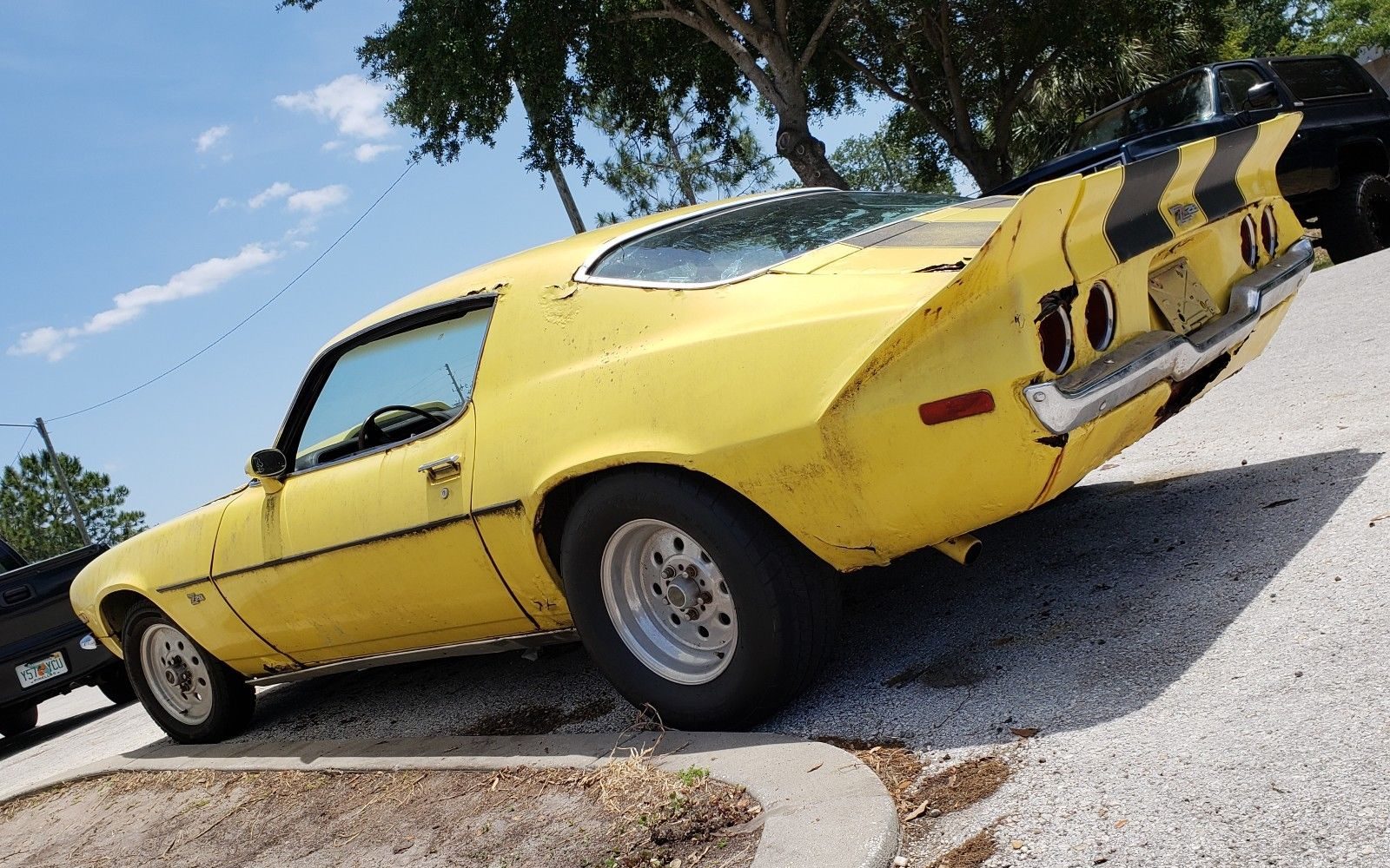 Even flawed by weather and rust, the bumblebee paint scheme is anything but subtle. I’m no Camaro expert, but that looks like a home-made wing, and definitely not a standard Z/28 unit .