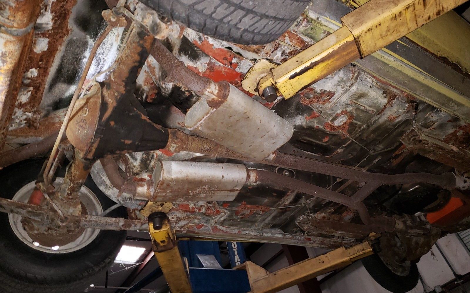 After the car sat for twenty years, the seller treated it to a “little clean up job” that seems to have included a power-washing of the underpan. High pressure water is great for exposing the true condition of the undercarriage, but not so great when newly-exposed bare metal rusts eight hours later.