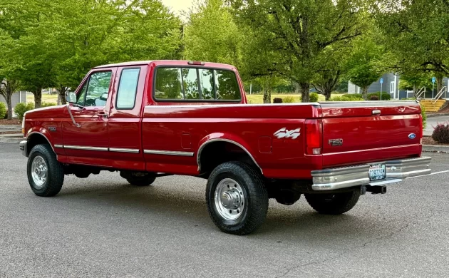 This F-250 features the extended cab and the long bed, and I really can’t get over how clean the bodywork is. I was expecting to see a mention of a respray in the listing, but the seller provides a detailed overview and doesn’t talk about paintwork, so I’m going to assume this is an original finish. The “4×4” graphics look correct, too, so that’s another possible indication if it never being stripped down for paint. The truck is well-optioned, with the Heavy Duty / XLT packages, towing mirrors, manual locking hubs, and full power options inside the cabin. The factory 16-inch wheels fit the truck perfectly, in my opinion.