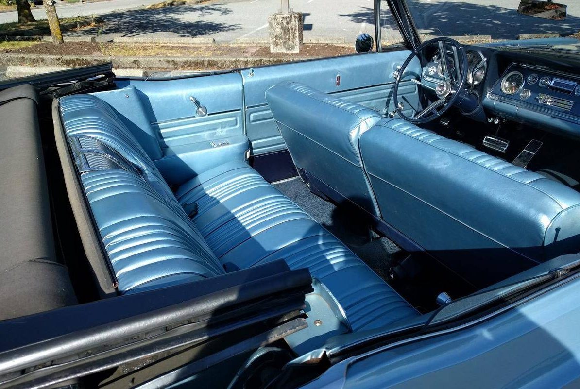 Here’s the engine described in the ad and on the air cleaner as the “super hight compression” Super Rocket 88 with 10.25:1 compression and 360 hp. The seller seems a bit reticent to show us what’s under the hood, but from what we can see it looks clean, complete and original. It doesn’t have AC, but it does have power steering and power brakes.