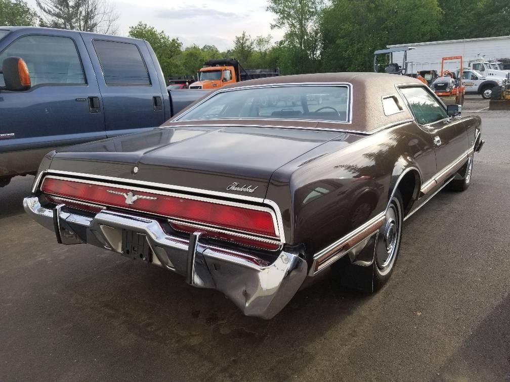 While Ford stylist kept the massive full-width taillights on this model, The sequential turn signals were eliminated beginning in 1972. Bummer! Unfortunately, this Thunderbird has some damage to the rear bumper. I can’t tell if the rear reflector totally escaped any damage, but it does appear the taillight did. It also appears the right rear fender escaped any damage. Other than this, the car looks to be in top condition, including its vinyl top. This car has the optional for 1973 opera windows with Thunderbird insignia. I always liked the shape of these better than the oval ones on the Continental Mark IV. It also has the optional wide bodyside molding that matches the top as well as front cornering lights. The car is triple brown.
