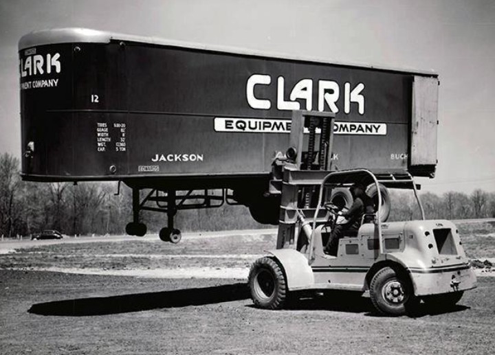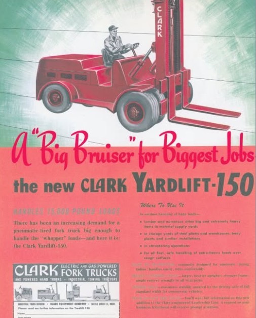 Clark traces its roots back to the late 1800s, but the company we know today was founded in 1917 in Buchanan, Michigan. Its fame grew after it invented the Tructractor, made for moving loads around its own industrial buildings. Visitors saw the contraption and asked Clark to build a few to sell. In 1922, Clark made the Truclift, a platform that used hydraulics to lift loads rather than gears and cables. The Truclift wasn’t very mobile, but it led to rigging a tiering attachment to Clark’s industrial truck: voilà, the forklift was born! The first Yardlift was made in 1946, specifically for rough terrain.