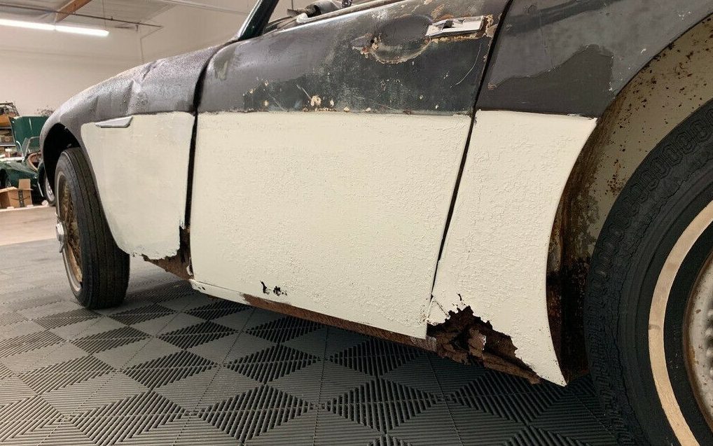 What initially caught my attention is that a motor car dealer is offering this vehicle for sale and it’s a bit rough to say the least – not what you would expect to find. The seller is very forthcoming about its condition, however. The initial thought would be how can this be a SoCal car in this kind of body condition? Well it’s not, it hails from Georgia and ended up in Santa Ana. The photos clearly show the extensive rot and the finish which appears to have been applied with a paint roller.