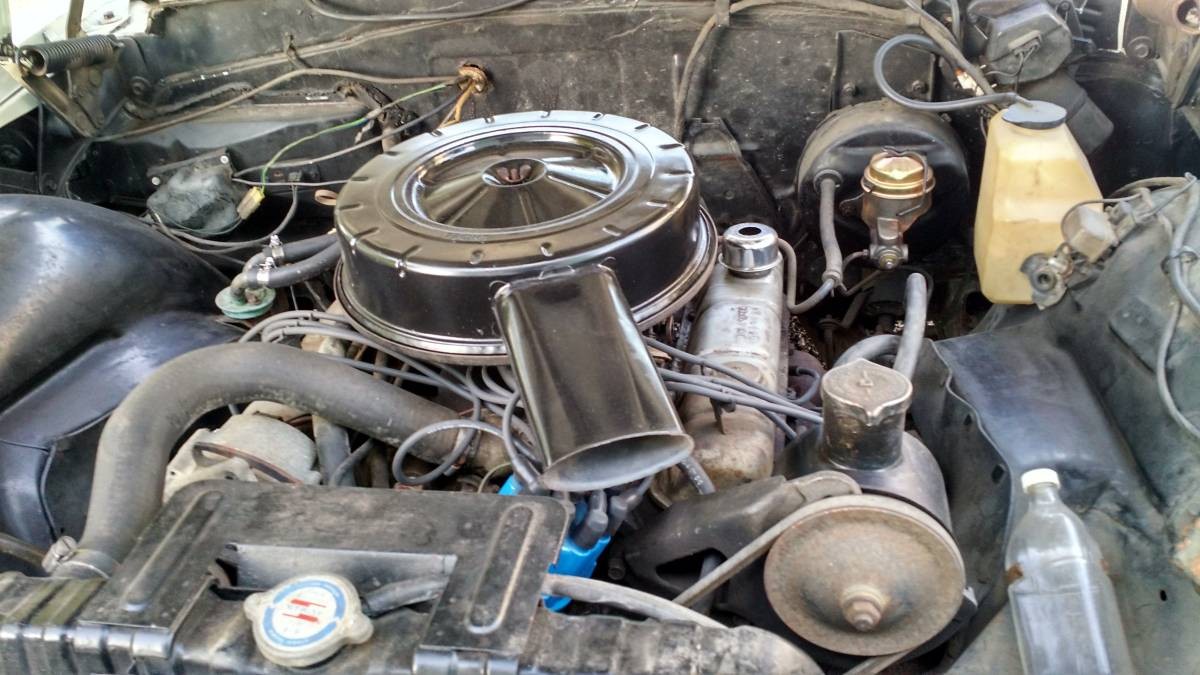 Here’s the 300 CID engine. Unless there’s a 4 barrel carb hiding under there, it’s rated at 210 HP. The 4 barrel version is rated at 250 HP. It doesn’t look like it’s had any detailing done under the hood, but that air cleaner looks shiny and new. There’s been some tuneup work done judging by the shiny new blue distributor cap and that tangle of plug wires. Hopefully, it just needs the carb rebuilt to bring this engine back to life.