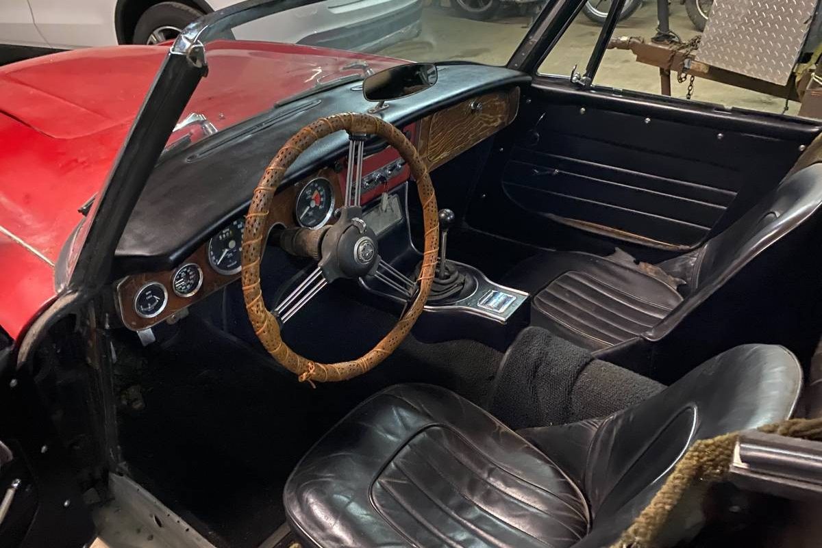 Here is the 2912 cc straight six-cylinder 150 hp Austin powerplant that was a constant in the Big Healeys. In 1965, AH added about 30% bigger carburation from the two standard 1bbl carbs than previous years’ engines, improving hp and top speed correspondingly. Reviewers claimed these cars were capable of 115 mph top speed. There were just 17,712 Mk IIIs made in the four-year span of their production, so these cars are not nearly as prevalent as American-made production cars of the same period and not as easy to get one in 2020. This engine room may show as well used, but, as Seller states in the posting, she now runs and the gears shift after a long storage period that was part of a 45-year continuous ownership of the car.