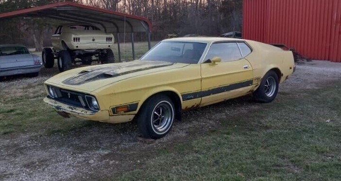 Mustangs, Camaros, Suburbans, and many other cars were produced in “generations”, with the shift from one to the next demarcated by styling, engine size, platform, rebadging, or any combination of these. The Mustang was introduced midway through 1964 as a 2450 lb four-seater designed in the “long hood, short deck” idiom that was so popular at the time. By 1973, although that model year remained a member of the first generation, the car looked completely different. Now weighing over 2700 lbs and with a wheelbase eight inches longer than the 1965 version, the car was losing that sporty feel. Engine output had been gradually degraded since 1970. Sales were following performance in the declining direction. But today, like many cars that met a lack of enthusiasm at introduction, the larger 70s Mustangs have found their niche with collectors. Here on eBay is a 1973 Ford Mustang Mach 1 bid to $4001, with no reserve. This project car is located in Truxton, Missouri.
