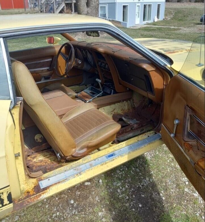 This Medium Bright Yellow exterior/Ginger interior is classic for the Mustang line-up in the 70s. Of course, this interior is going to need plenty of work to put it right. Yes, those are rust holes in the rear floor, and those aren’t the only places you’ll see daylight where you shouldn’t. From dash to floors, this one will need it all. On the other hand, parts are not difficult to find, and this one does have its gauges, interior trim and handles, and seats. Many of the relics we see here at Barn Finds are not nearly so complete.