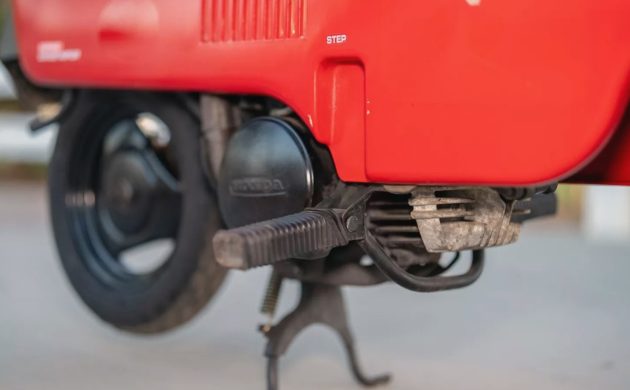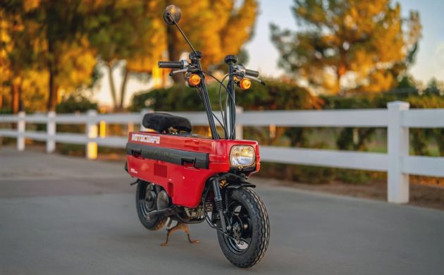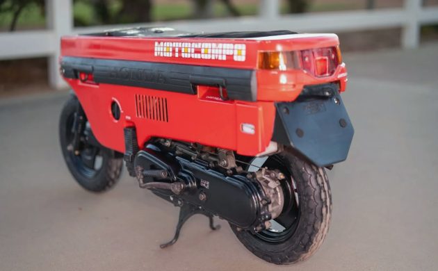 Otherwise, this looks like a nice example, and the seller has provided a ton of great photos in all stages of this caterpillar-to-butterfly’s life. The photo above shows it folded down so you can sneak it into the back of your Honda City car, or almost any other car, but that’s what they were made for. The theory was, you could drive to the edge of uber-congested Tokyo, park outside of the city, take this 95-pound Motocompo out of the back, and ride it to your job without having to deal with traffic.