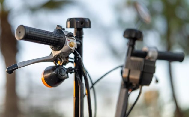 The handlebars fold down and into the body of this bike via those two knobs on the top. Just unscrew them, fold the bars down, and you’re set. The seat also folds down. The horn button is the yellow one, and the turn signals (“What are those for, dad?”) are operated by the switch above it. That’s it for controls, other than a typical twist grip throttle on the right handlebar and two brake handles, one on each side. Honda makes a battery-powered version now called the Moto Compacto.