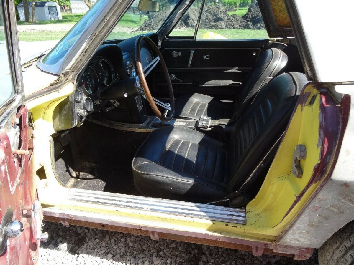 Other than the carpeting, the interior is very useable. The water damage in the carpet could be from a leaking seal between the top of the windshield assembly and the lift off hard top, or it could be a sign that the birdcage on this car is rusty. All Corvettes of this era leak. Some a little and some a lot. As for the rest of the interior, a set of reproduction door panels can be found at any of the Corvette parts houses. The carpet can be easily replaced, and modern insulation kits that are cut to fit are available as well.