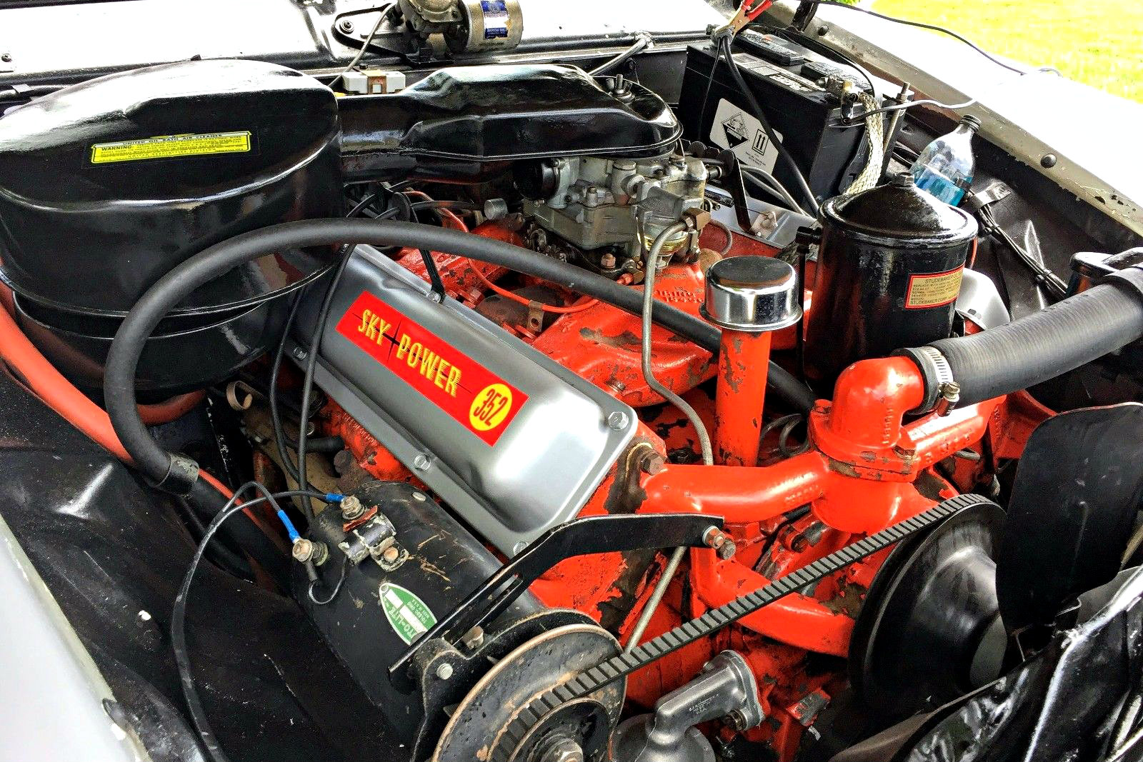 Under the hood is an extremely clean engine and bay. There is a great deal of factory paint present on the 352 engine, and in the bay itself. Thought to have covered 105,000 miles in its lifetime, it would seem this Hawk is a solid driver and needs little to be enjoyed. There are a few “creative” fixes done to this car that I am not exactly thrilled about. The windshield washer bottle is literally a soda bottle fitted to the driver side of the engine compartment. Also there was apparently an issue with the horn button, or its wiring, so a new button has been fashioned to the lower portion of the steering column. Both of these issues are minor and could certainly be remedied, but it makes me wonder what else could have been repaired in this manner?