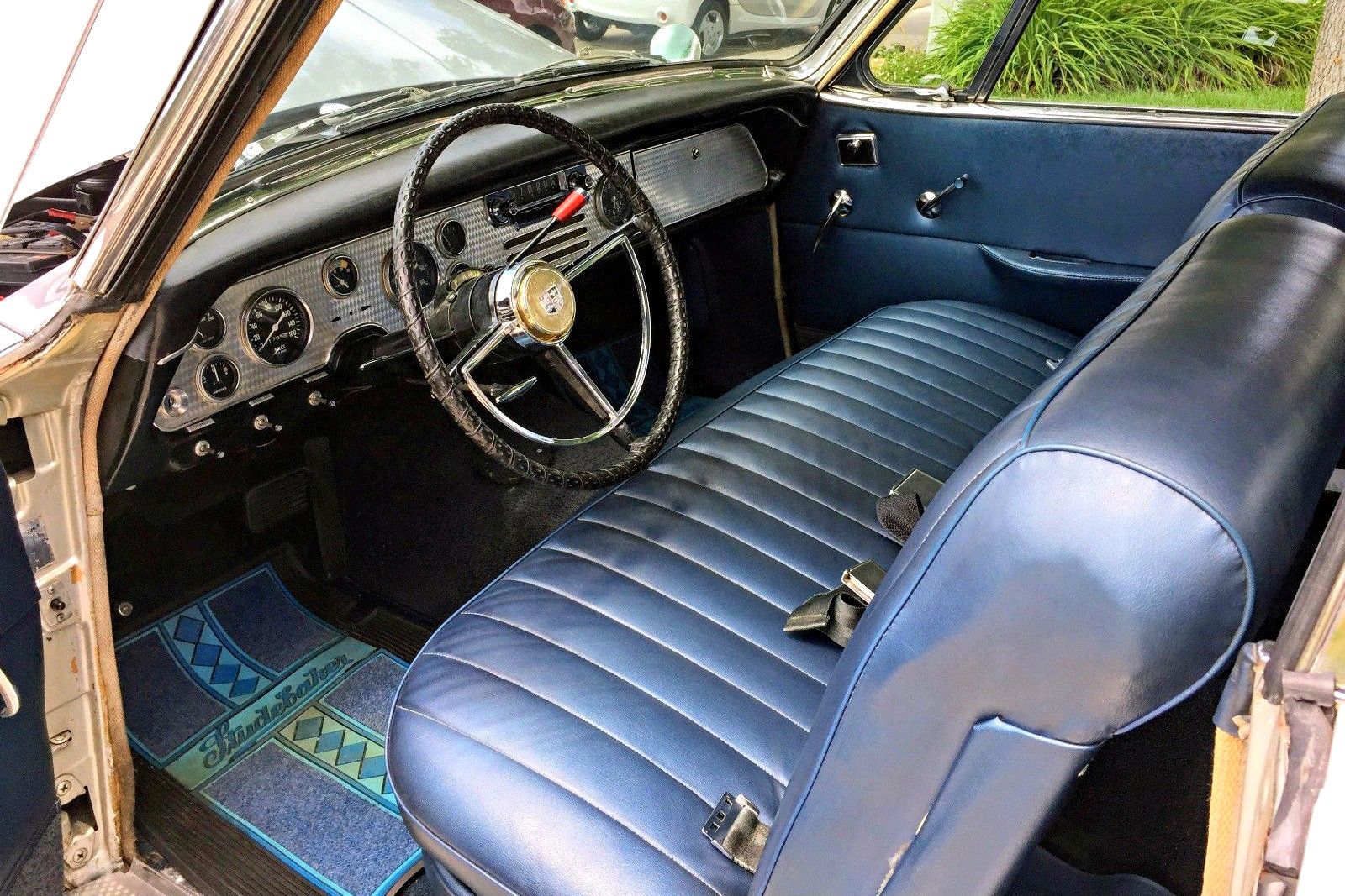 The beautifully engine turned dash is always a treat in these Hawks, and the interior of this car is beautiful. Covered in a steering wheel wrap, the rim of the wheel may suffer some minor damage or perhaps even a few cracks like so many vintage wheels like to do. The horn button suffers from some minor cracking, but as whole, the steering wheel presents nicely enough for an original condition driver as does the rest of the interior. Thankfully there is little else in the interior that reflects any signs of aging.