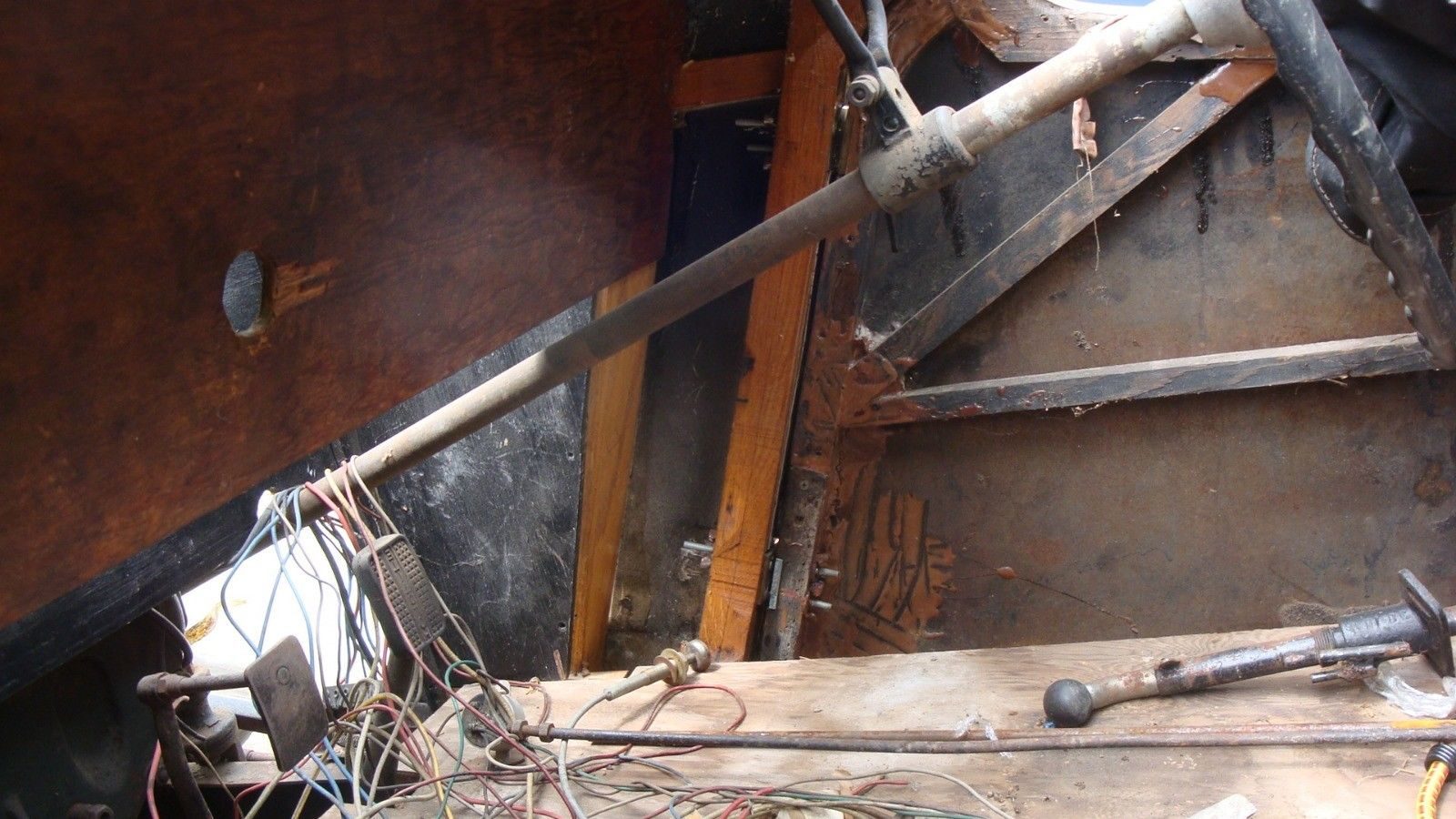 There’s not much inside, well, inside. Unless there’s a pile of parts somewhere, you’ll be starting from scratch. The auction does describe it as having a brown leather interior, but they don’t say where. The shift lever goes through the hole in the panel and is a push-pull mechanism like a motorcycle.