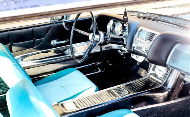 The interior is new and looks very good overall based on the limited photos. The black padded dash and instrument panel, door panels, and black carpet look sharp and the seller chose to upholster the front bucket seats in aqua leather instead of black leather, which may not be everyone’s cup of tea. There are no photos of the rear bench seat but I assume it matches the front seats.