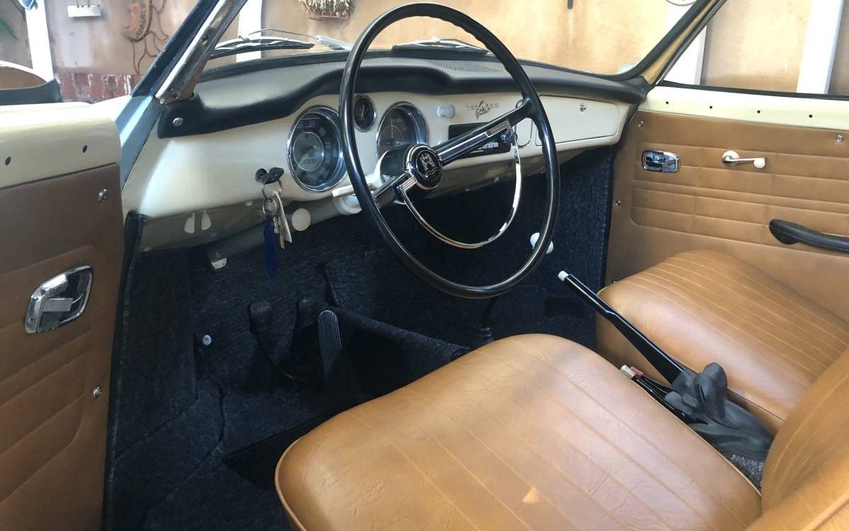 The tri-tone interior consisting of tan vinyl upholstery, charcoal gray carpeting, and white painted metal surfaces is seriously sharp looking, it’s also supposed to be new. The door cards, upholstery panels, dash pad, and very thin rear seat bottom show as new and unused – definitely this car’s highlight.